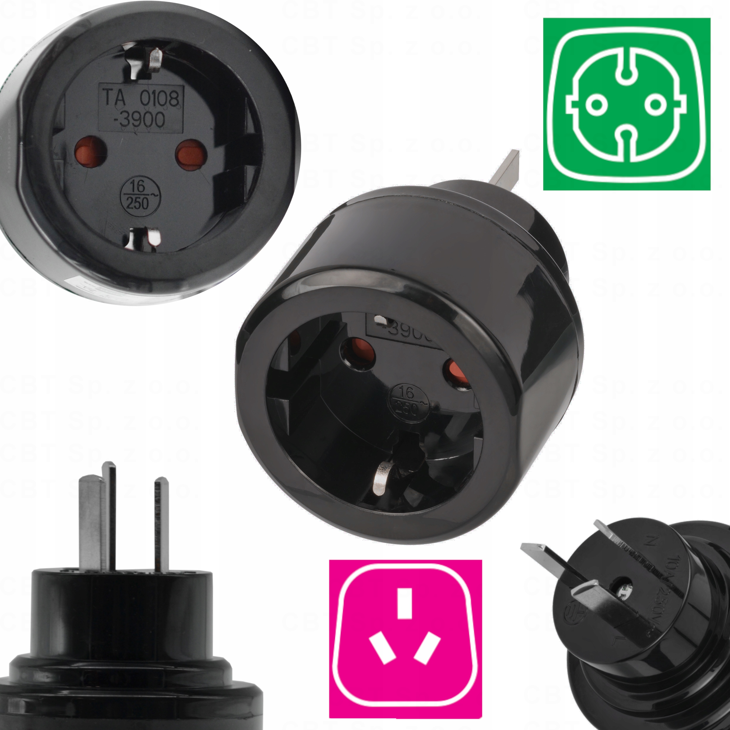 - Дорожній адаптер для підключення електроприладів за допомогою штепселя Schuko до країн: Італія, Чилі , Сальвадор, Сан-Марино та на Мальдіви