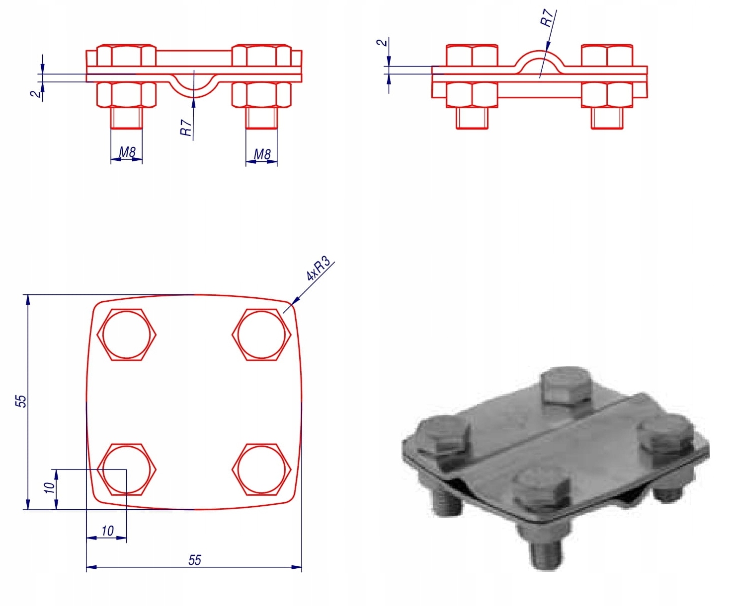 З’єднувачі використовуються для з’єднання провідників і заземлювачів. Виготовляємо кілька десятків типів конекторів залежно від розміру та типу. Захищений від корозії латунню. З’єднання виконані з листової сталі товщиною 2 мм. Елементи з’єднуються гвинтами залежно від потреб.
