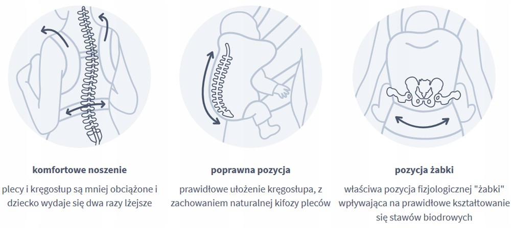- ергономічна панель підтримує спину дитини, дозволяючи розташувати її в анатомічному положенні, і утримує ніжки в " Положення M" (жаба), яке впливає на правильне формування тазостегнових суглобів