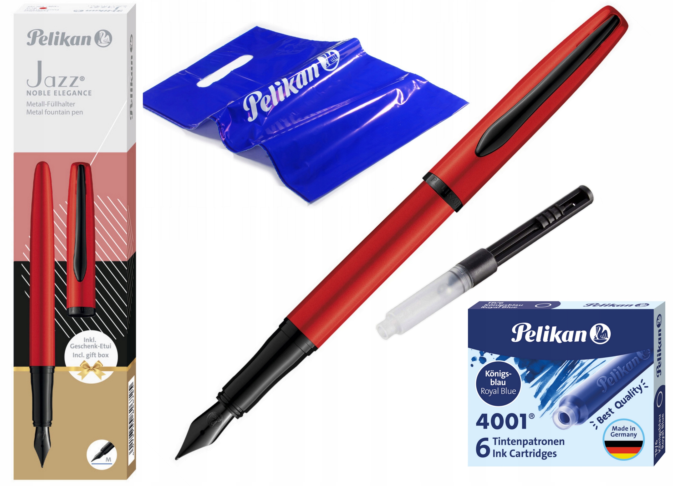 ПЕРЬОВА РУЧКА JAZZ NOBLE ELEGANCE RED PELIKAN + КОРОБКА КОРОТКИХ ЧОРНИЛЬНИХ КАРТРИДЖІВ (6 ШТ.) + ПОРШЕНЬ ВІДПОВІДНОСТІ + ПОДАРУНКОВА СУМКА З ФОЛЬГИ