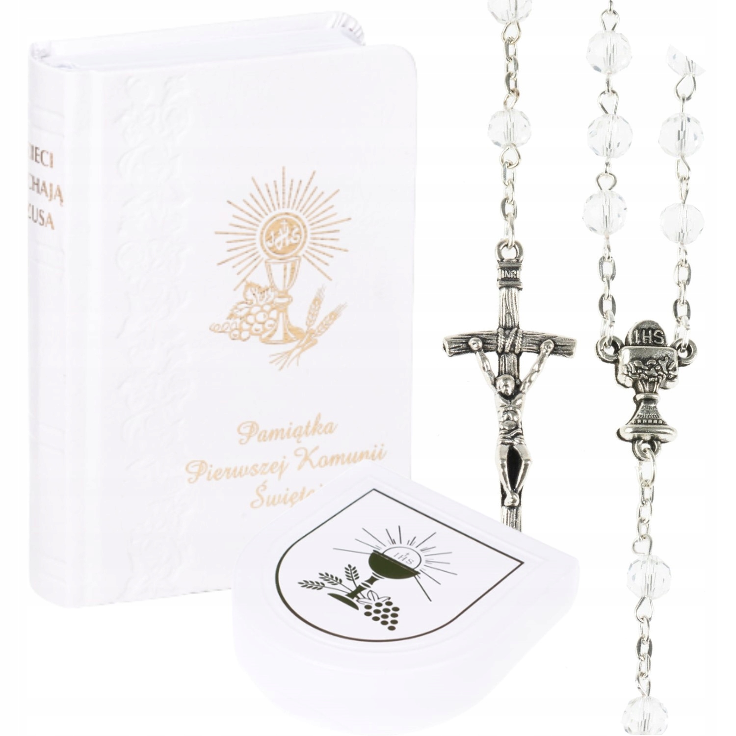 Вервиця для причастя для дівчинки чи хлопчика, виготовлена з прозорого кришталю. Має красиво мерехтливе покриття. Хрестик і чашка IHS виготовлені з металу, відрізняються надзвичайною увагою до деталей.