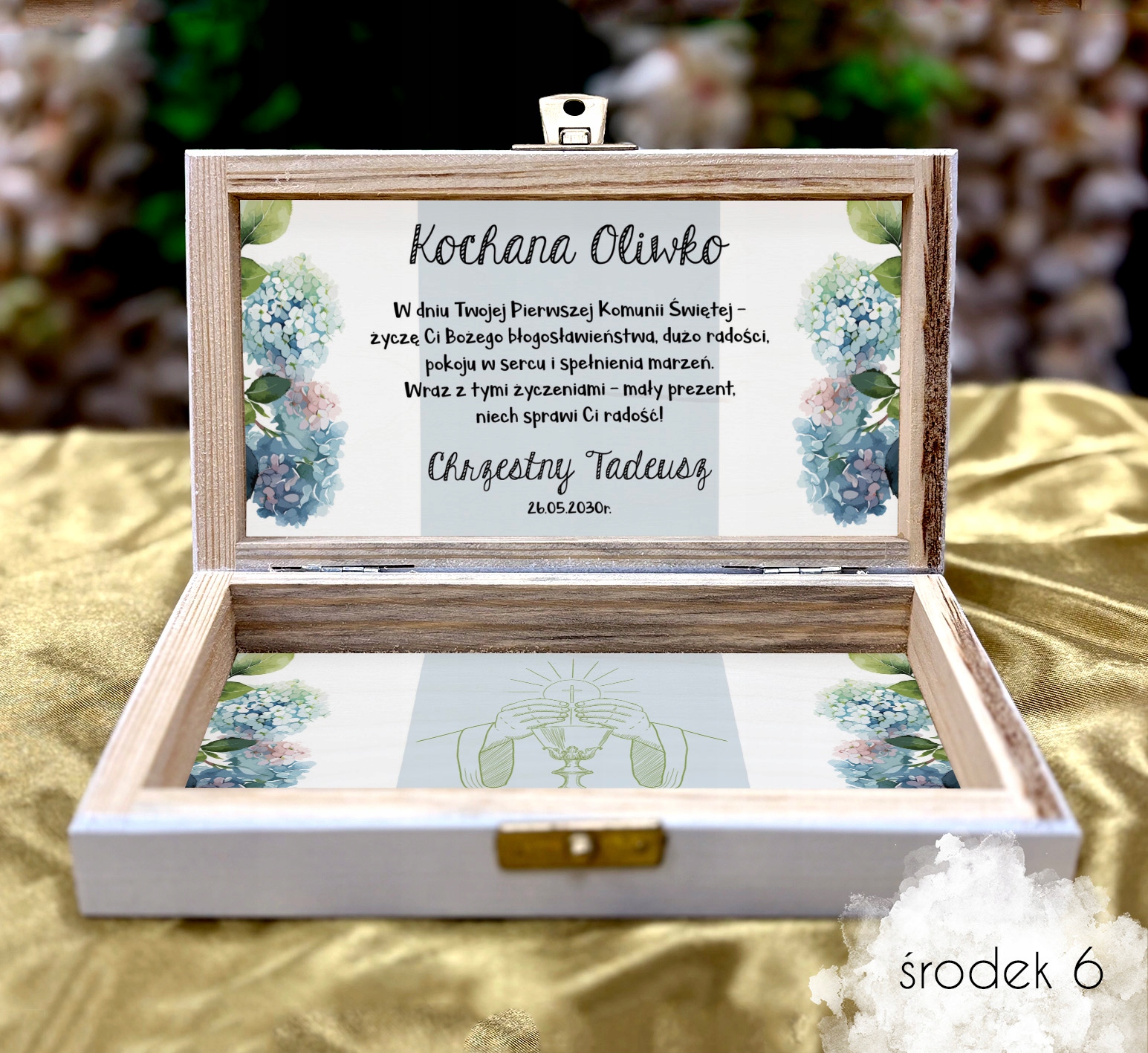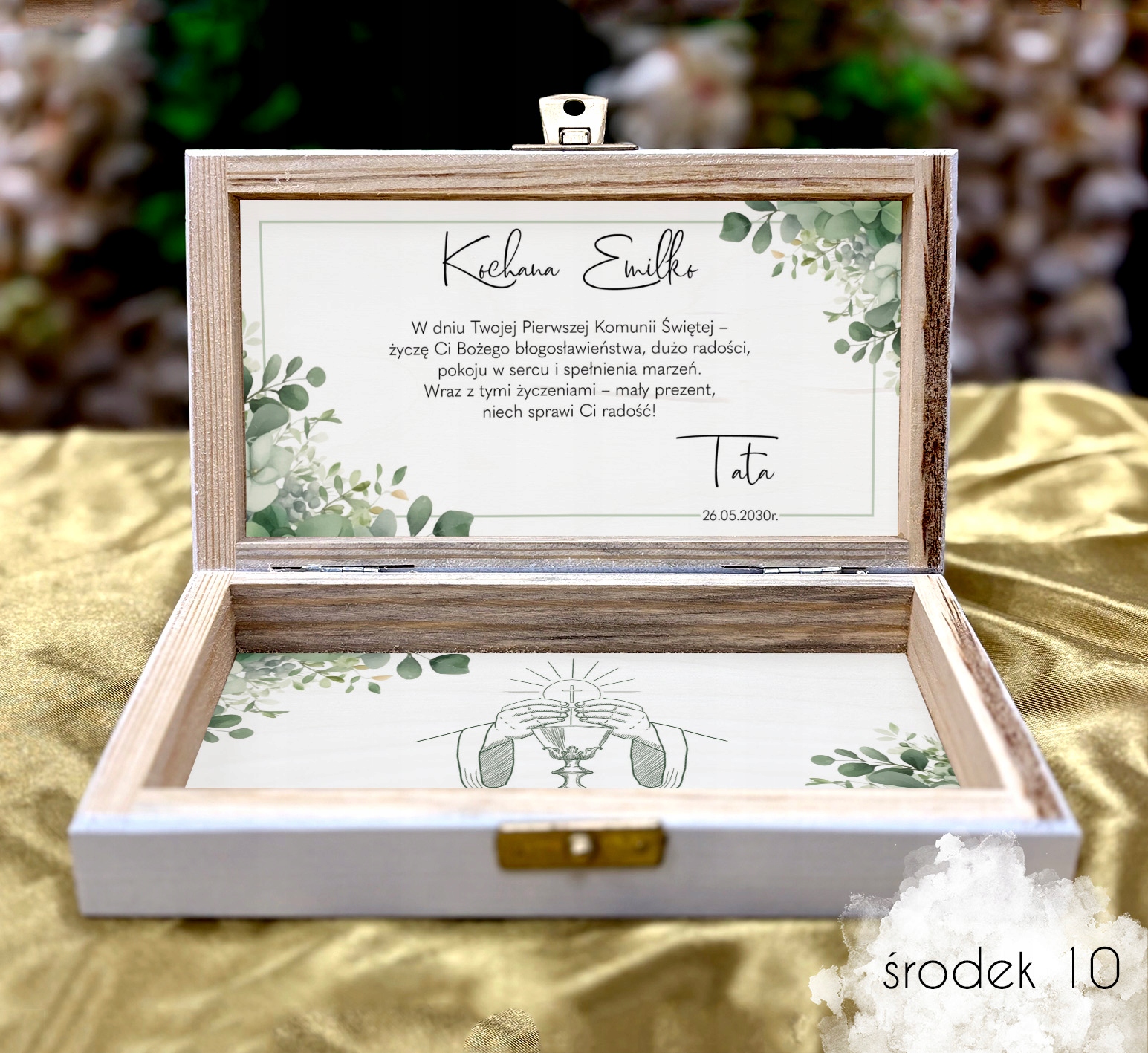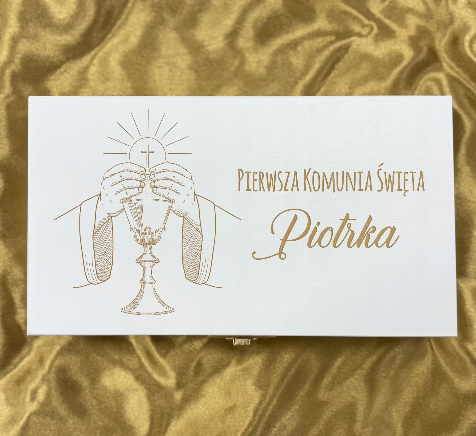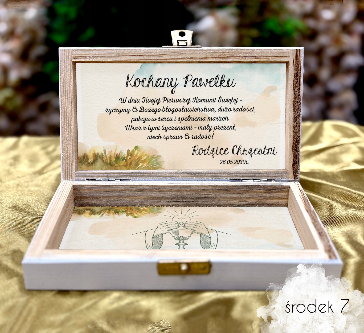 Унікальна, елегантна коробка грошей, ідеальна як подарунок для першого Святого Причастя . Зроблено з увагою до кожної деталі, з гравіруванням на кришці та персоналізованими побажаннями всередині. Це не лише практичний, але й пам'ятний подарунок, який буде залишатися з вашою дитиною роками.