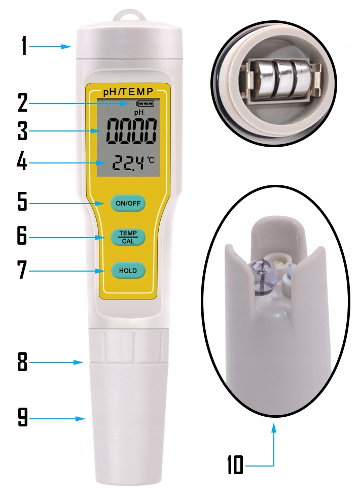 Функція ATC (Aавтоматична Tтемпературна Cкомпенсація) - вимірювання та компенсація температури, індикація тестера в діапазон 0-60°C. Завдяки цьому ми отримуємо точний результат кислотності даної рідини.