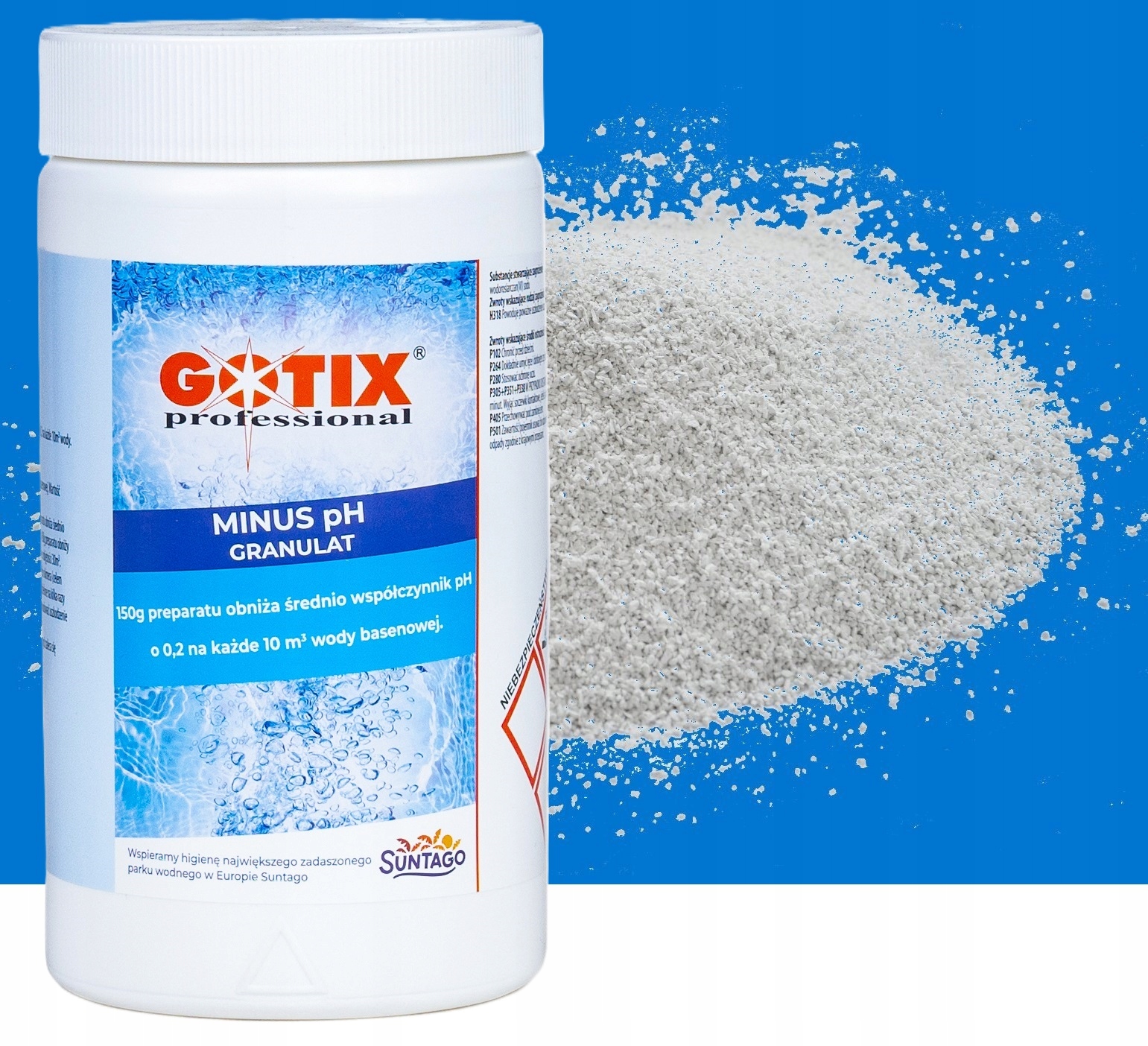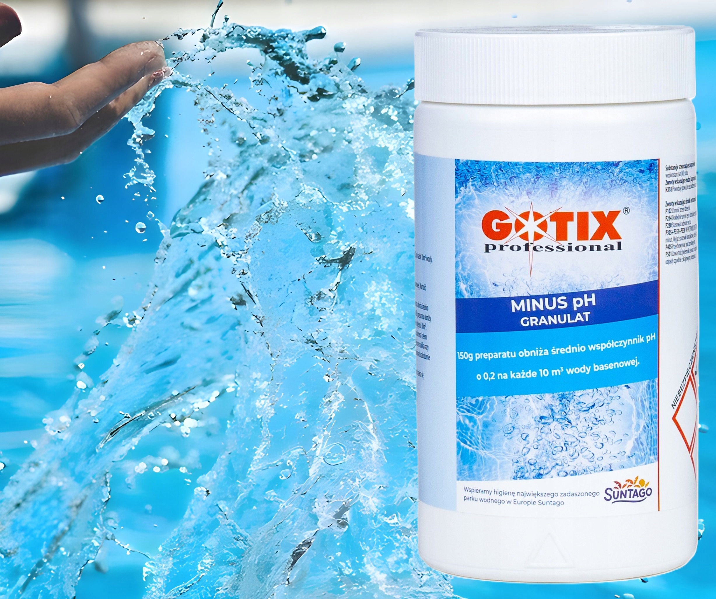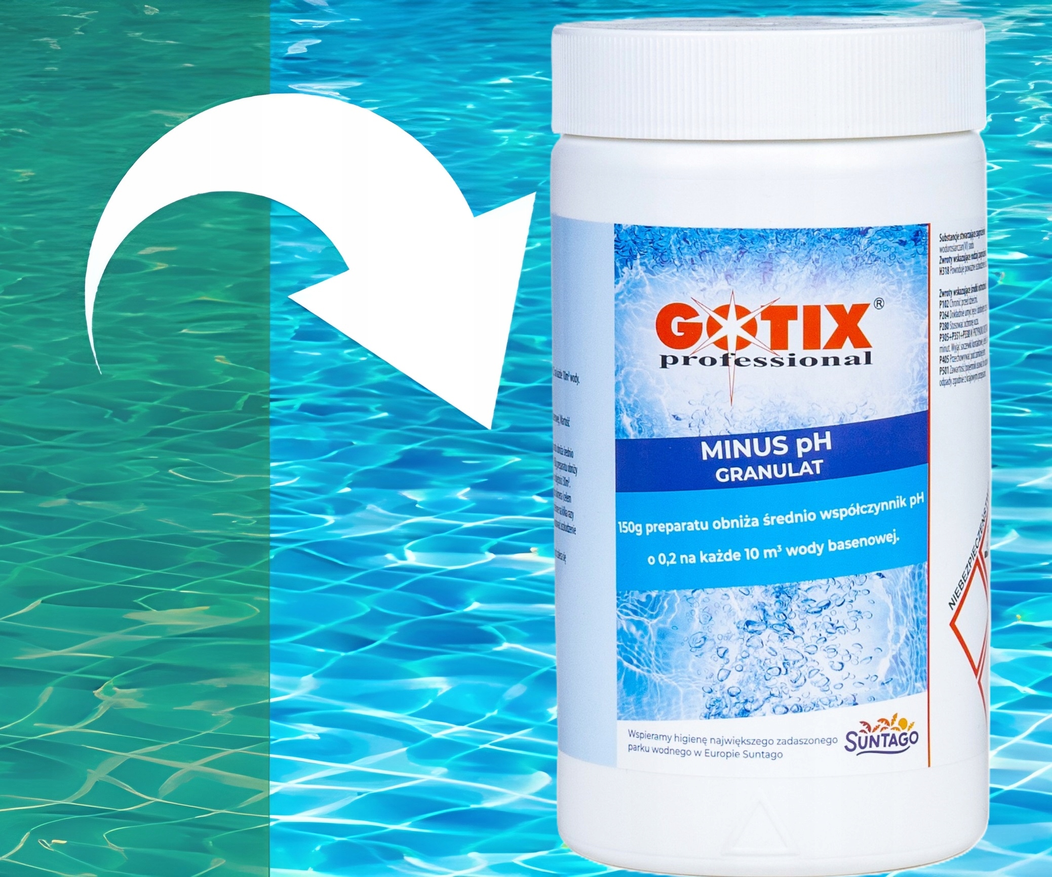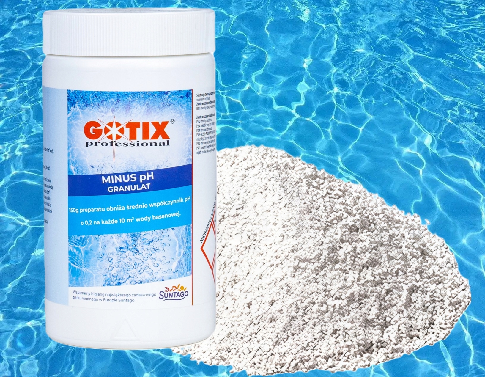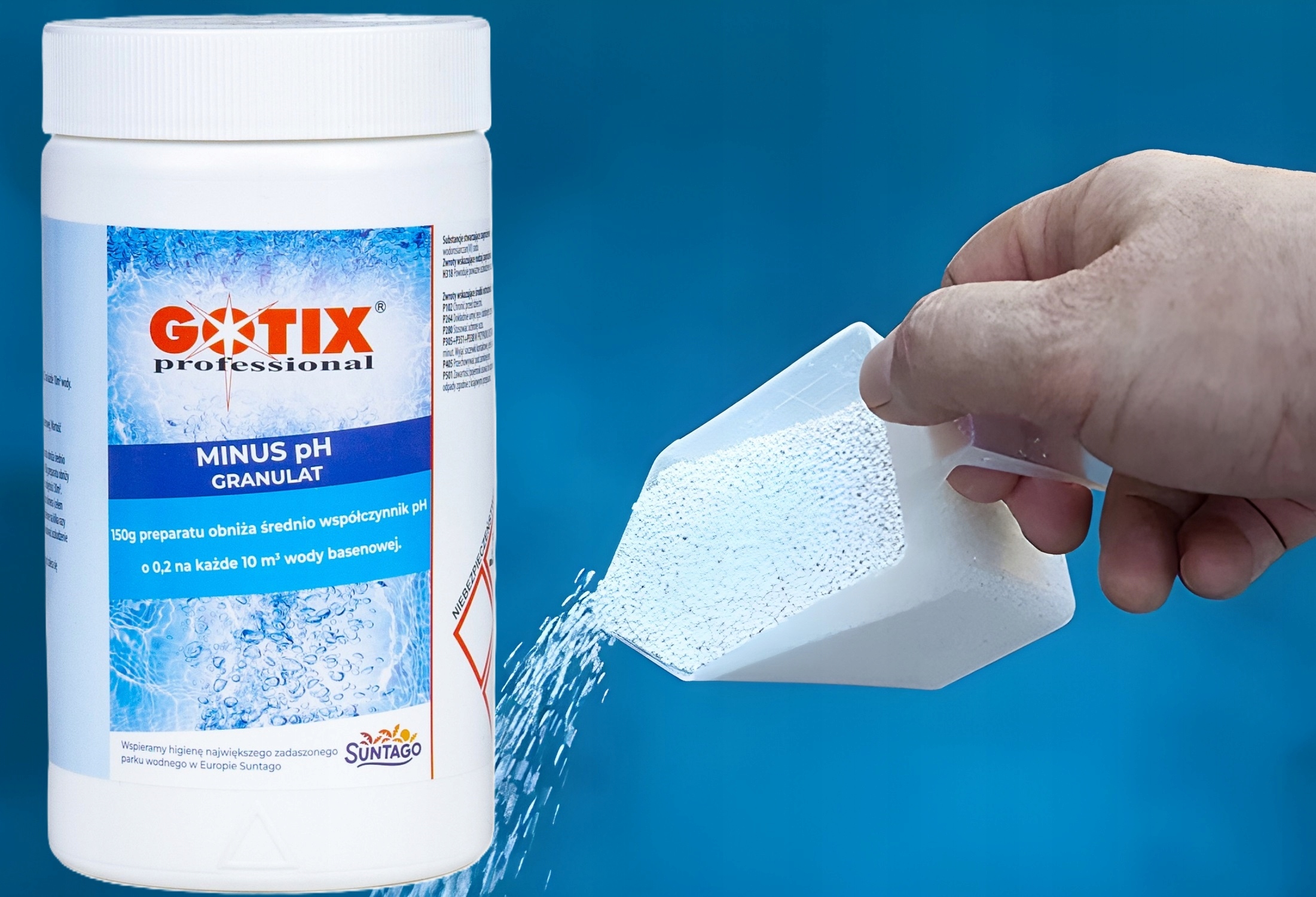 Для зниження значення pH використовується кислотний препарат MINUS PH GOTIX PROFESSIONAL у формі гранул. у воді басейну до ідеального діапазону 7, 0 - 7,4. Оптимальне значення PH становить від 7,0 до 7,4, тобто стільки ж, скільки людська сльоза. Отримання значення PH у вказаному діапазоні є необхідним для належної роботи інших хімікатів для басейну.