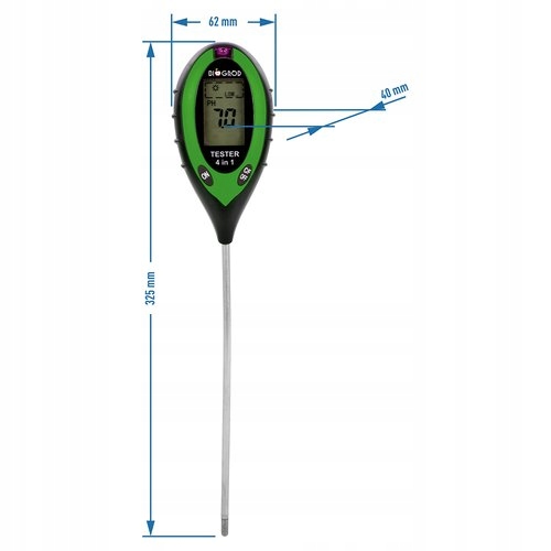 - Чотири функції - електронний тестер дозволить вам перевірити вимірювання рН (кислотності), вологості, температури та сонячного світла ґрунт як на ділянці, так і в домашньому саду, теплиці та на балконі!