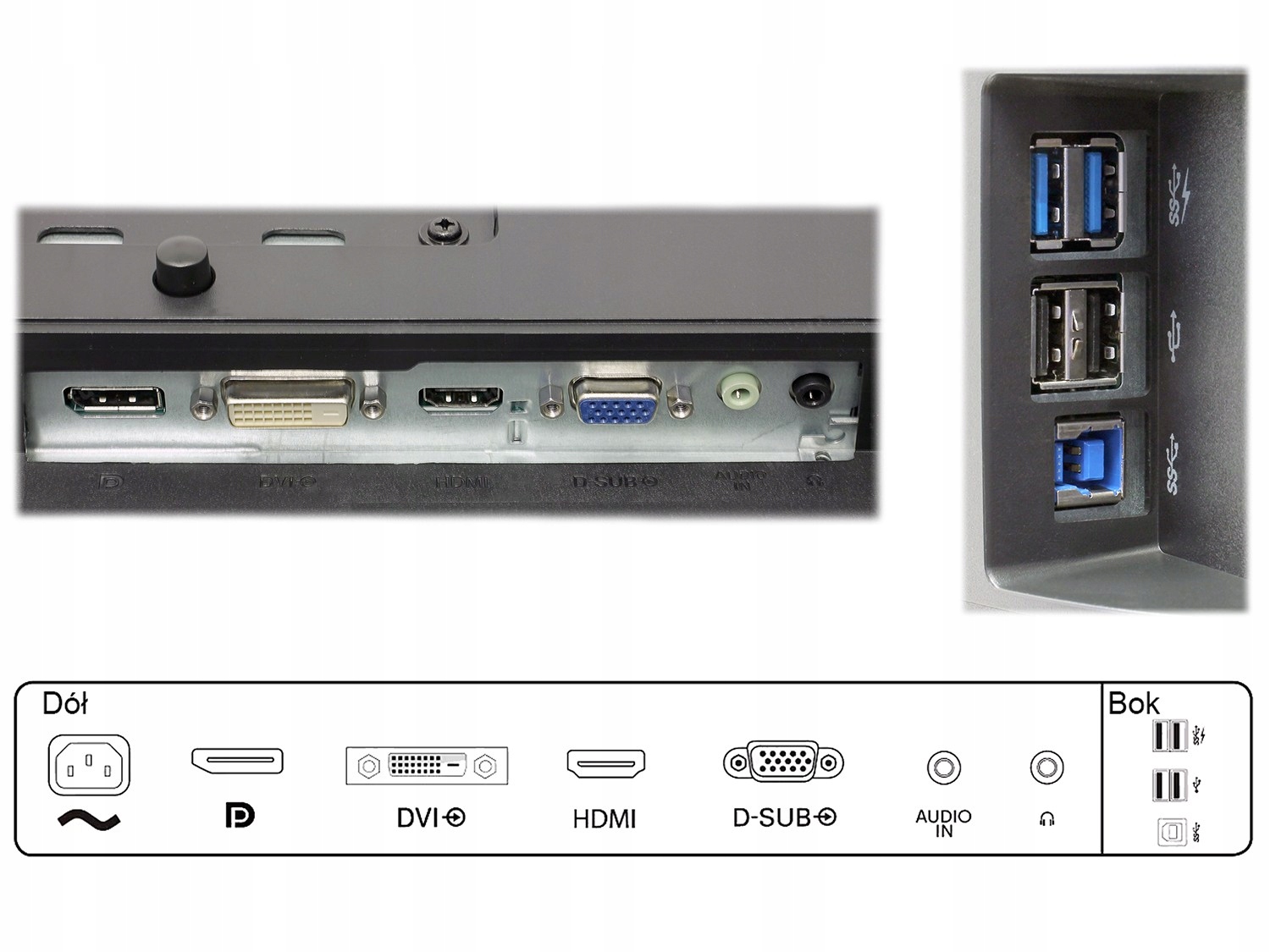 - Роз'єми: 1x DisplayPort 1.2, 1x HDMI 1.4, 1x DVI-D, 1x D-Sub (VGA), 2x USB 3.0 (1 з функцією швидкого заряджання), 2x USB 2.0, 1x USB 3.0 (в), 1x в. аудіороз'єм ПК 3,5 мм, 1 вихід аудіо навушники 3,5 мм роз'єм