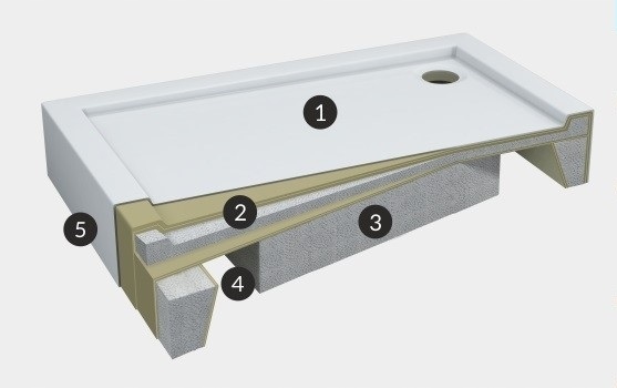 - 02 - багатошарове структурне посилення душового піддону з високими ізоляційними властивостями (тепло- та звукоізоляція),