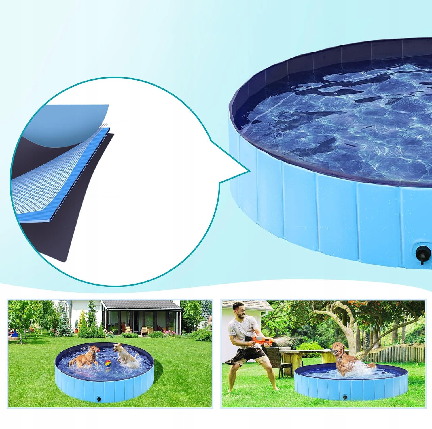Матеріал великого басейну для собак повністю оновлений і потовщений. Товстий ПВХ матеріал, стійке до розривів посилення запобігає проколам у собачому басейні. Протиковзкий дизайн на дні робить домашніх тварин безпечнішими під час гри.