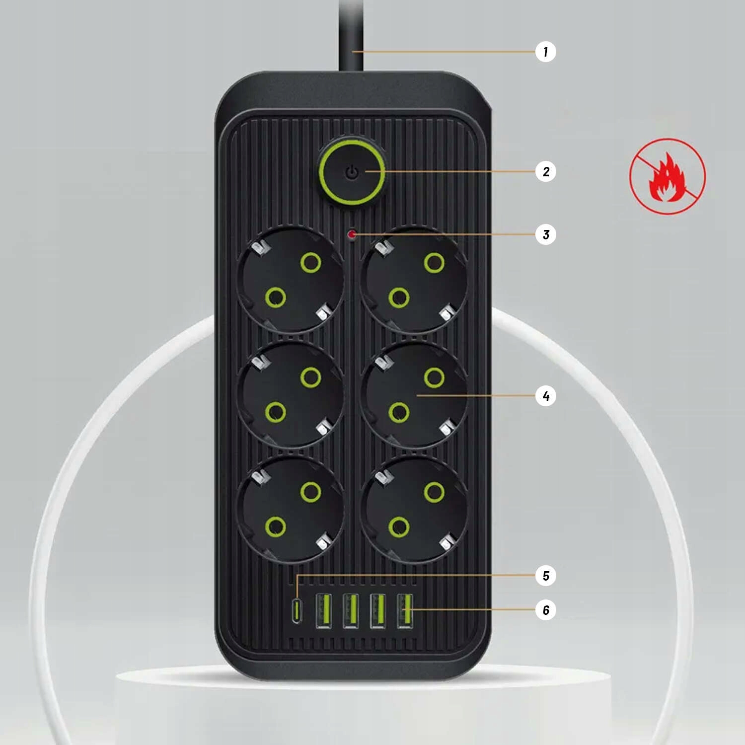 Основними функціями цього подовжувача є шість традиційних Розетки ЄС, чотири порти USB, один порт USB C PD, довжина кабелю 2 метри, вимикач і світлодіод.