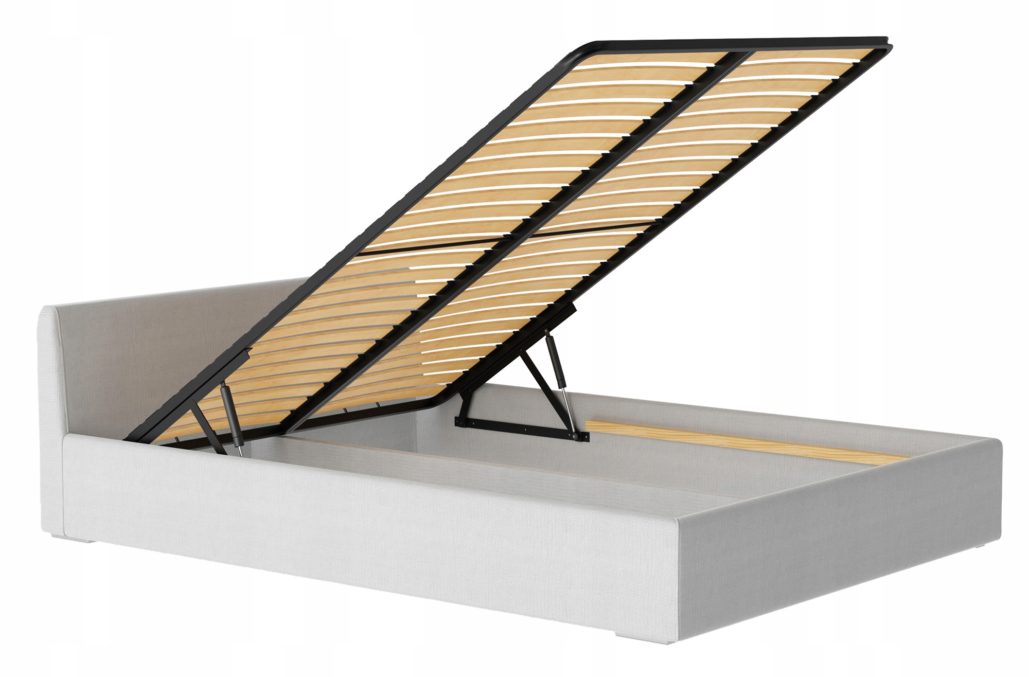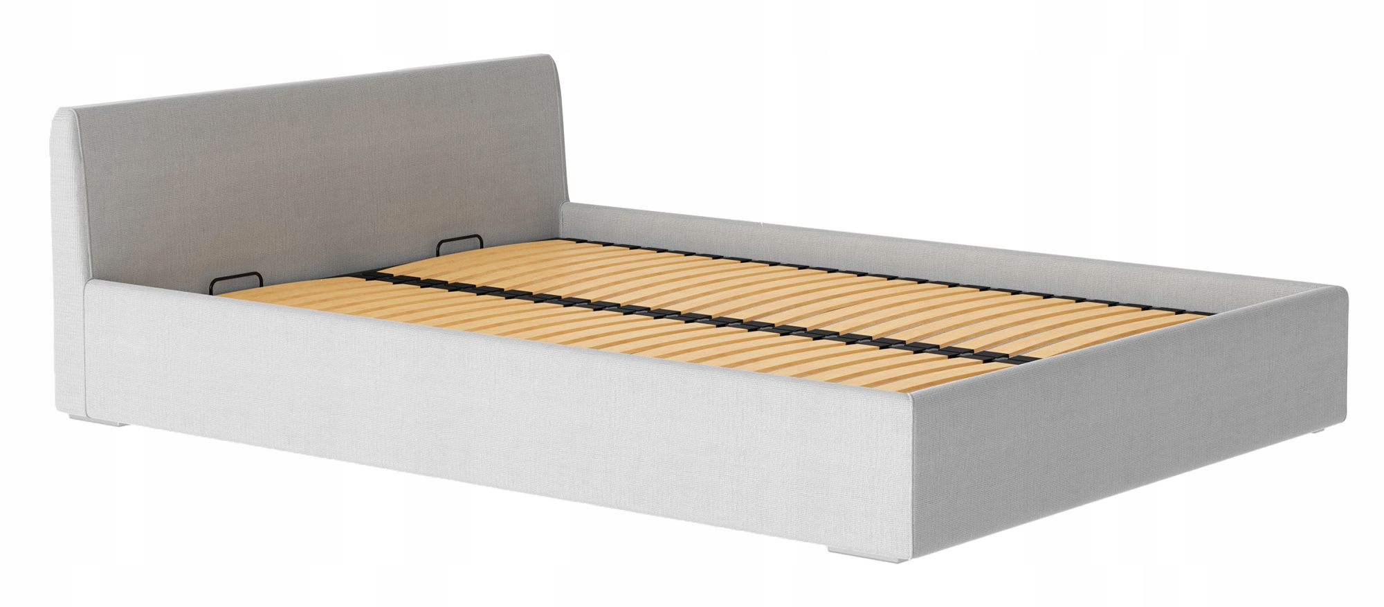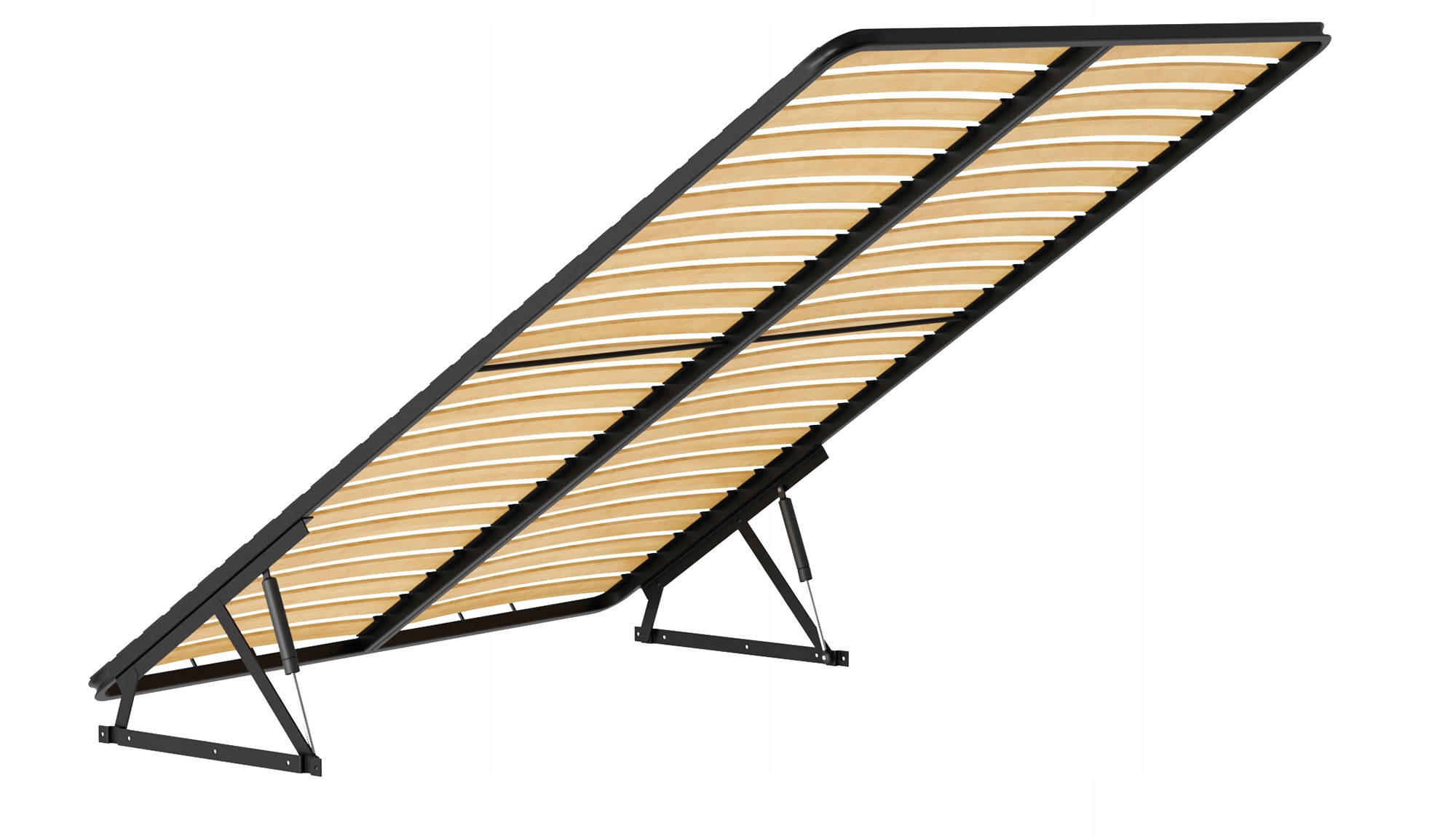 Піднятий гнучкий матрацний каркас (ліжковий вкладиш)! Каркас виготовлений з профілю 20х30х2, пофарбований порошковою фарбою в чорний колір. Він заповнений профільованими березовими смугами шириною 53 мм, які закріплені в рамі рухомими пластиковими кінцями. Каркас має 48 (24x2) гнучких ламелей, вбудованих у гумові ручки, що забезпечує чудову підтримку та амортизацію матраца. Каркас призначений для ліжок, що забезпечує доступ до ящика за допомогою актуаторів (газових пружин). Каркас має каркаси, які тримають матрац, отвори для приводів і два отвори для кріплення ременів для підйому рами (ремені можна придбати на окремому аукціоні). У набір входить набір приводів для самостійного складання!