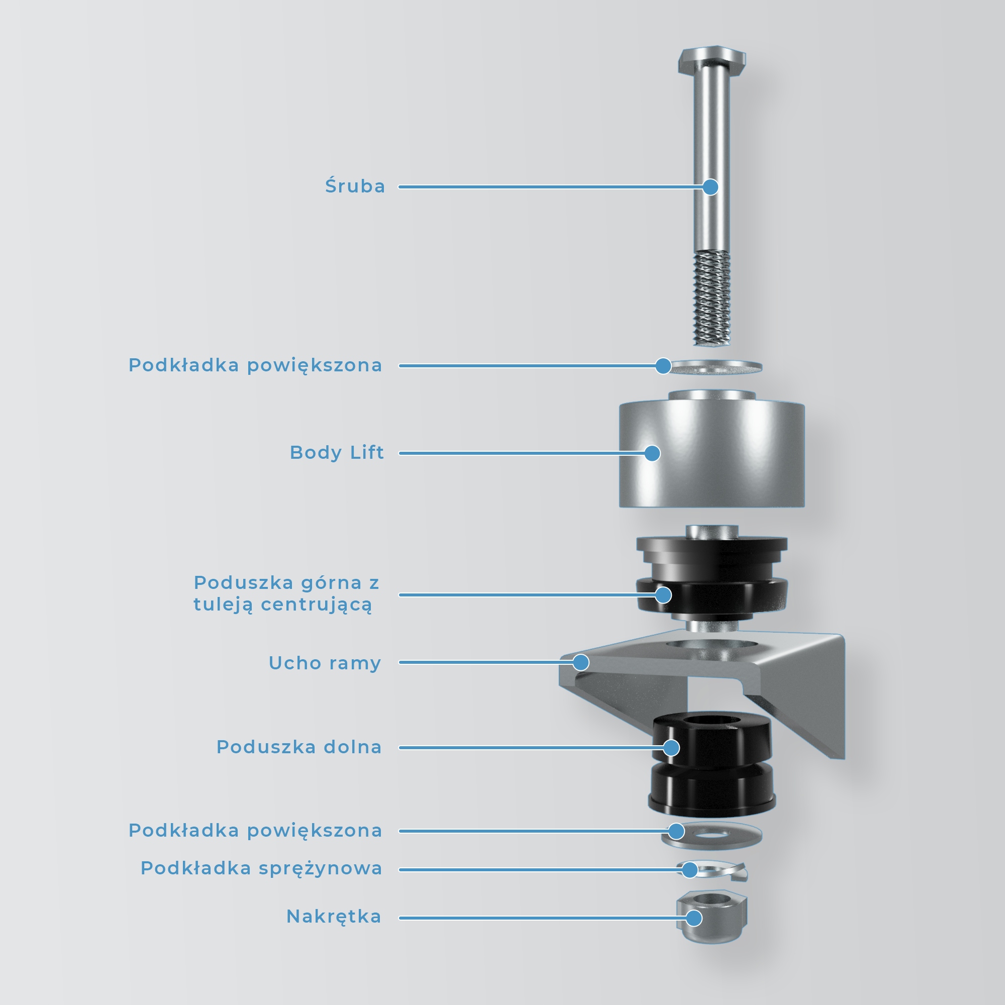 Підйомник тіла встановлений у фабричних отворах, вся структура повинна зміцнюватися за допомогою гвинтів M12 у класі 10.9 , що забезпечує безпечне з'єднання з рамкою.