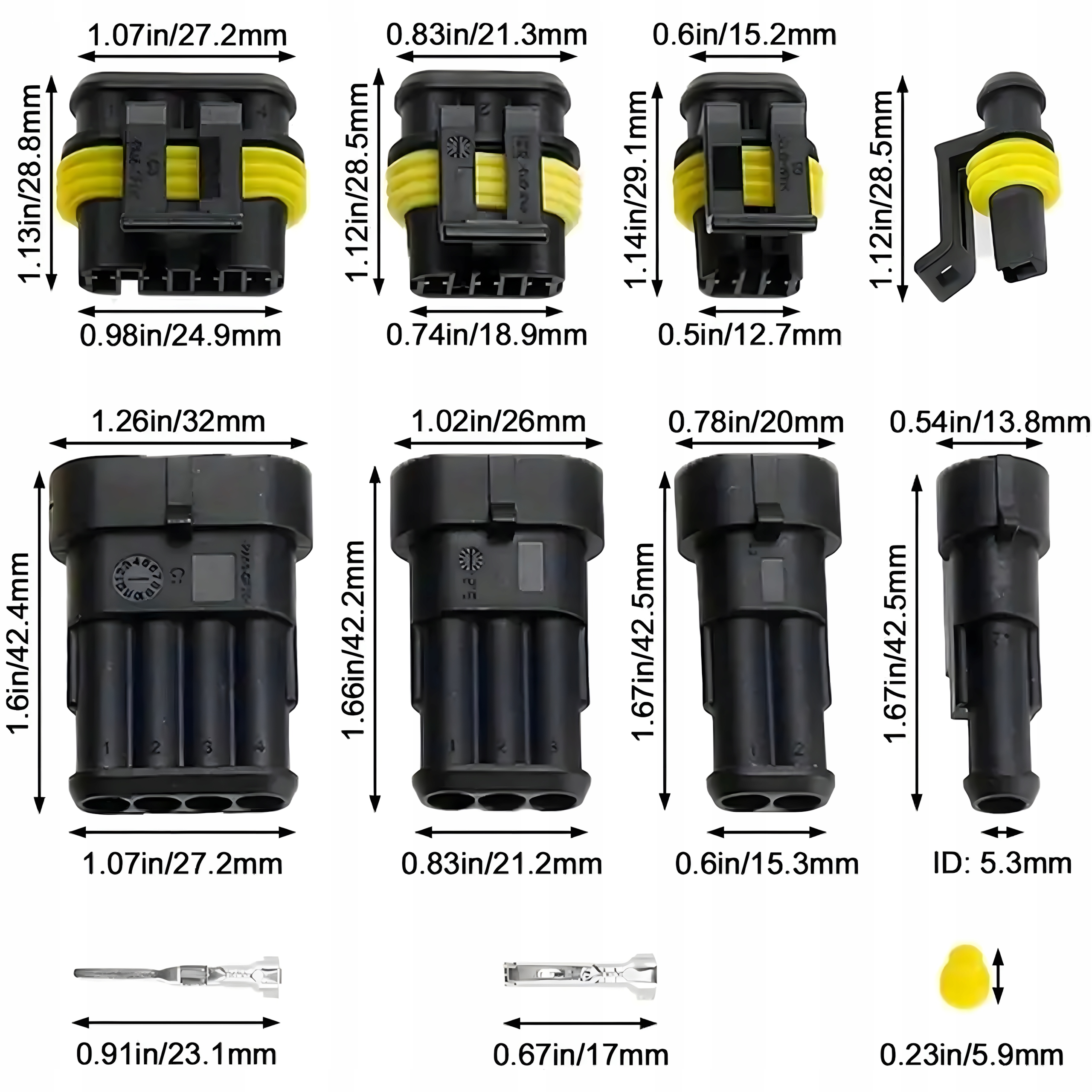 ✔ 4pin (6 наборів) 6 X Роз'єм чоловічого корпусу, 6 х Жіночий роз'єм, 24 x чоловіча шпилька, 24 х жіноча оправка, 48 x силіконова водонепроникна пробка,