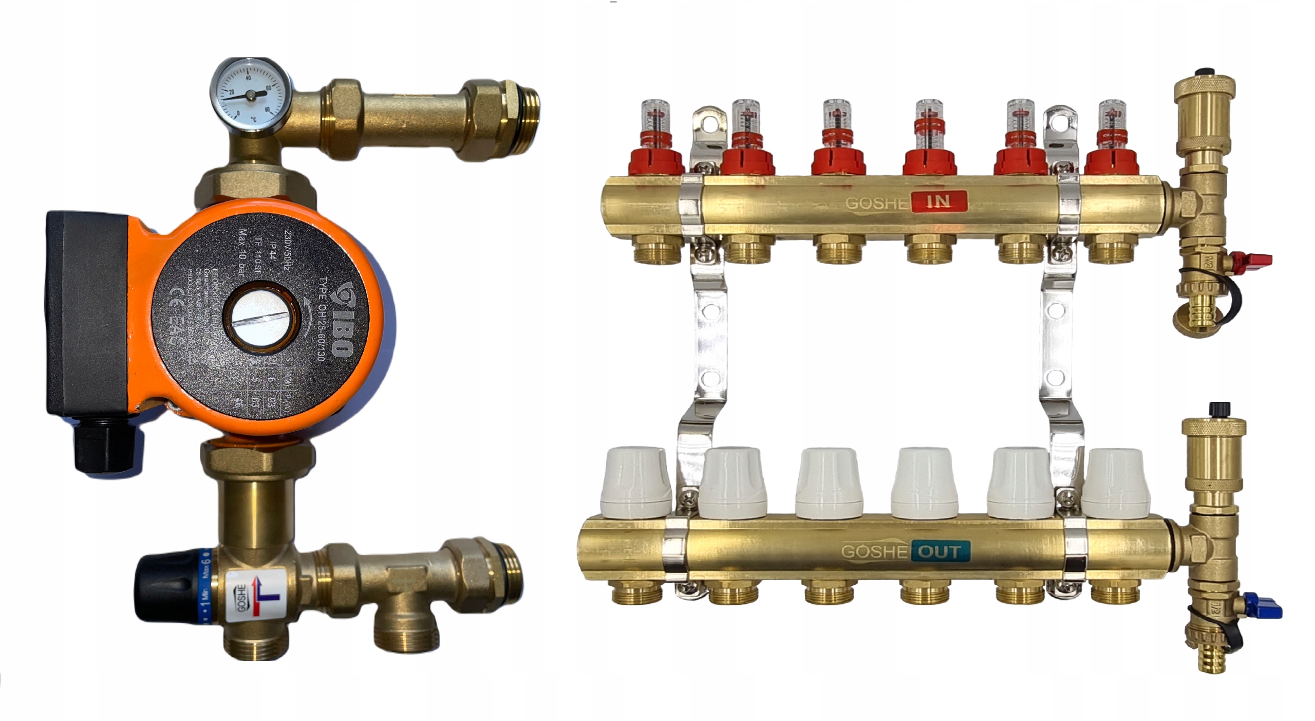 - Група, яка автоматично регулюватиме температуру води під підлогою відповідно до налаштування клапана та захищатиме систему від надто високої температури.