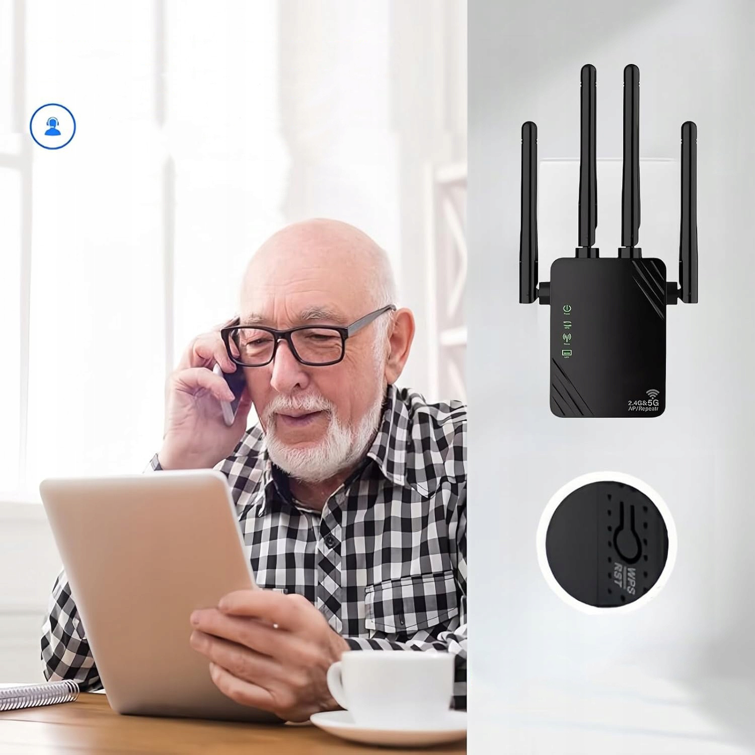 🛜🛜 з мертвими точками Wi -Fi. Інтелектуальна контрольна лампа показує оператора ретранслятора в режимі реального часу. Верхній індикатор - це лампа/WAN, а потім лампа для розширення Wi -Fi, світильник сигналу Wi -Fi та силова лампа.
