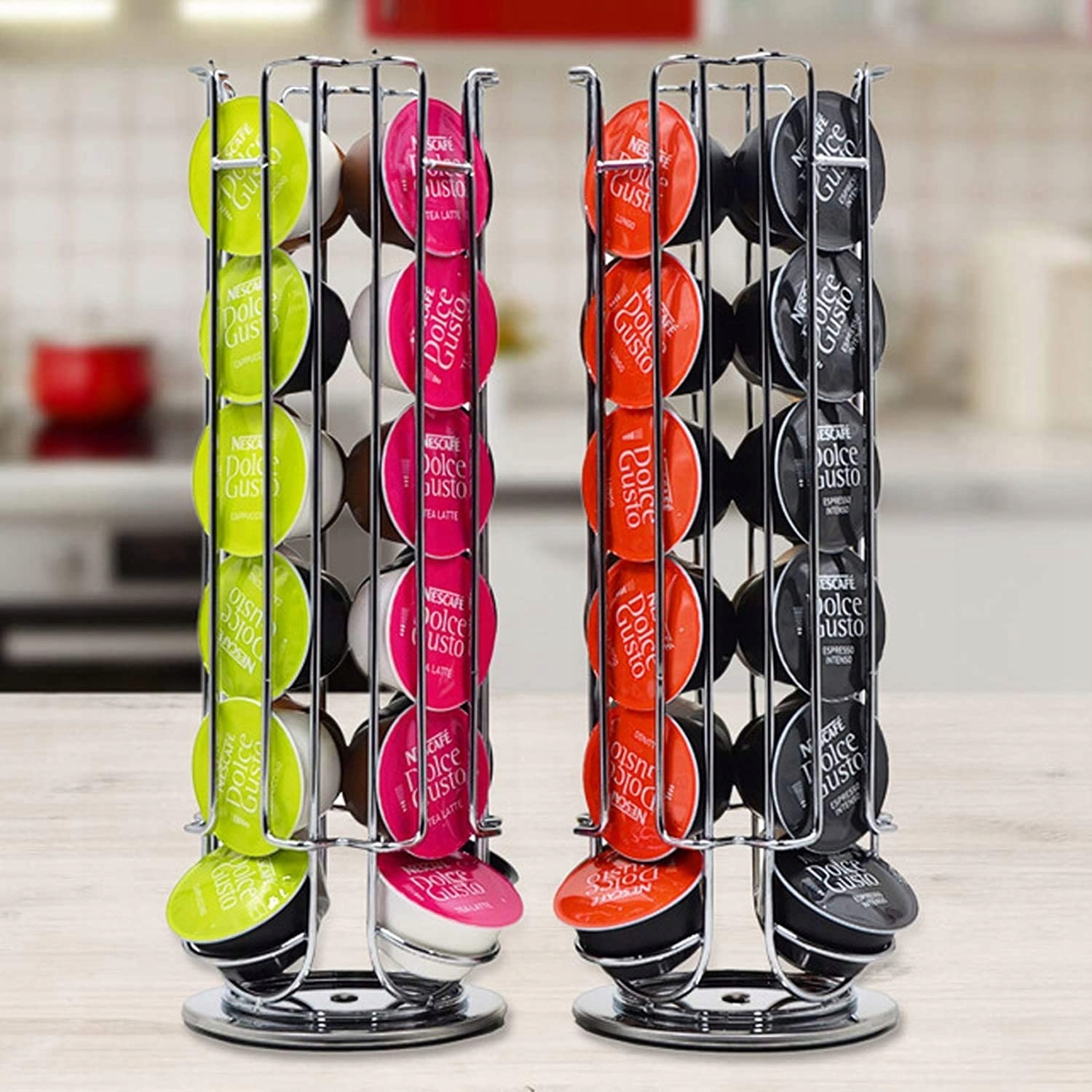 - СТИЛЬНИЙ ДИЗАЙН. Цей стильний поворотний тримач для капсул дозволяє зберігати до 24 капсул Dolce Gusto на 4 різних рівнях.