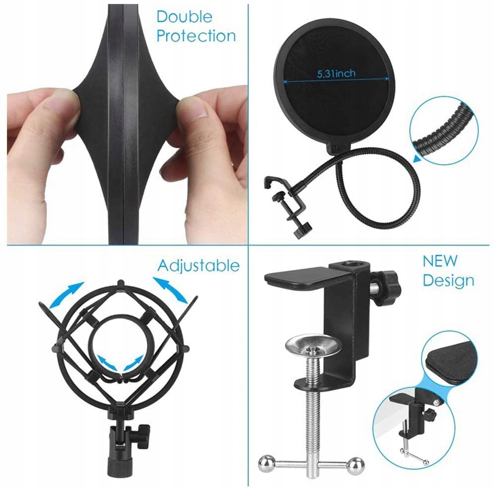 Аксесуари для шумопоглинання Мікрофон постачається з мікрофонною стійкою, амортизатором, настільним затискачем, пінопластовим ковпачком, USB-кабелем a-b і поп-фільтром. Ці аксесуари можуть ефективно мінімізувати шум, спричинений небажаною вібрацією.