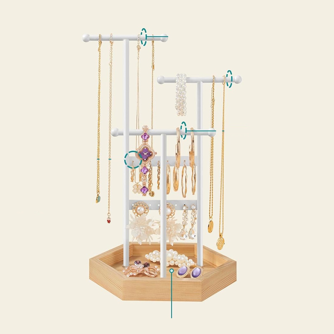 Органайзер має 16 отворів для сережок, 3 "Т"-подібні планки різної висоти та піднос для прикрас, який дозволяє організувати сережки, каблучки, браслети, намиста та навіть довгі ланцюжки. Позбавтеся від заплутаних намист, втрачених сережок і зіпсованих прикрас. Ваші каблучки та брошки знайдуть своє місце на нижній підставці для прикрас.