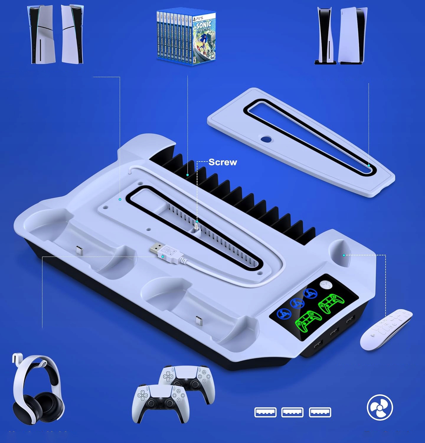 ПІДСТАВКА ДЛЯ PS5 З ВЕНТИЛЯТОРОМ ОХОЛОДЖЕННЯ ТА КОНТРОЛЕРОМ PS5 ДЛЯ ДОМА