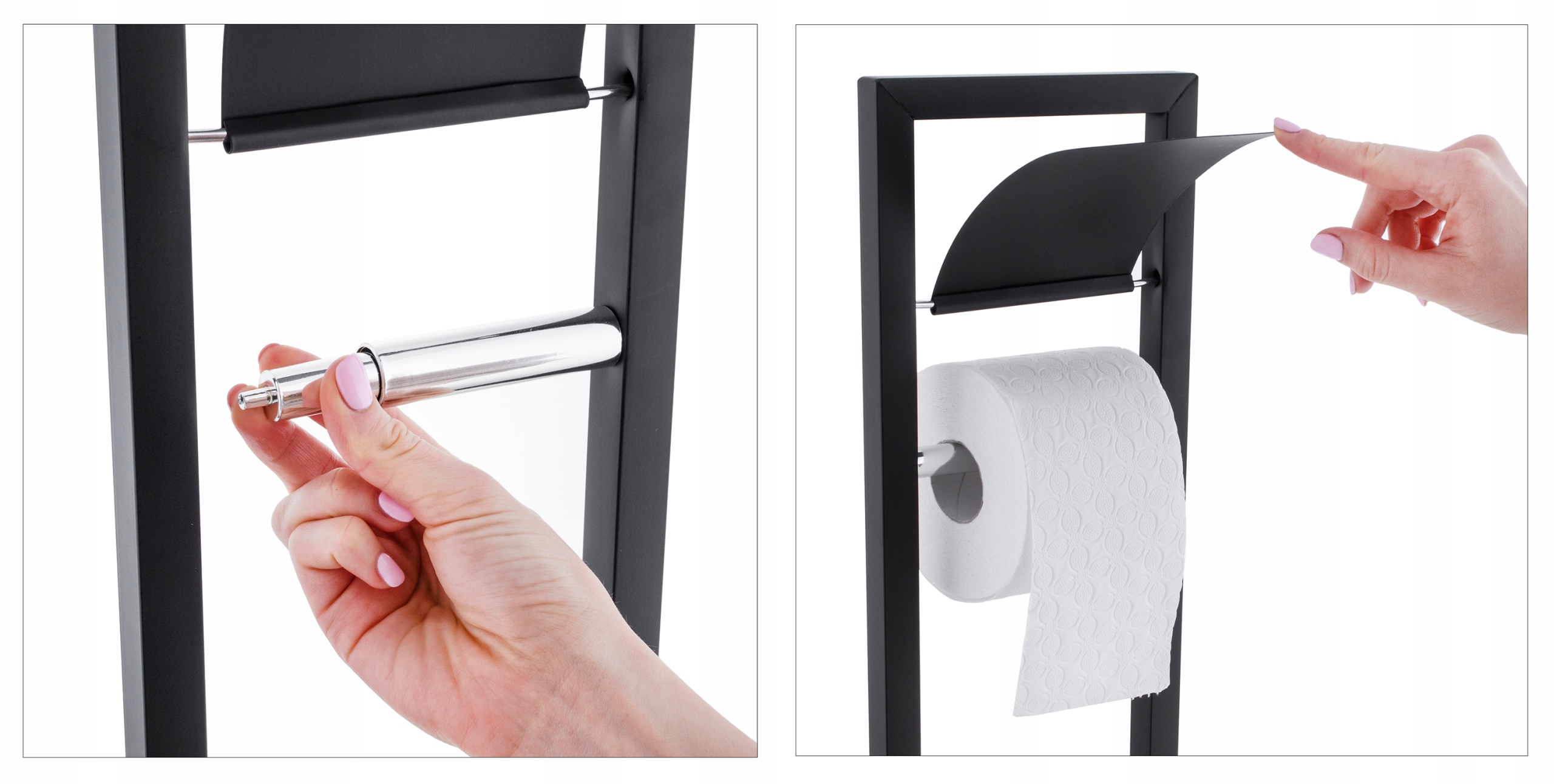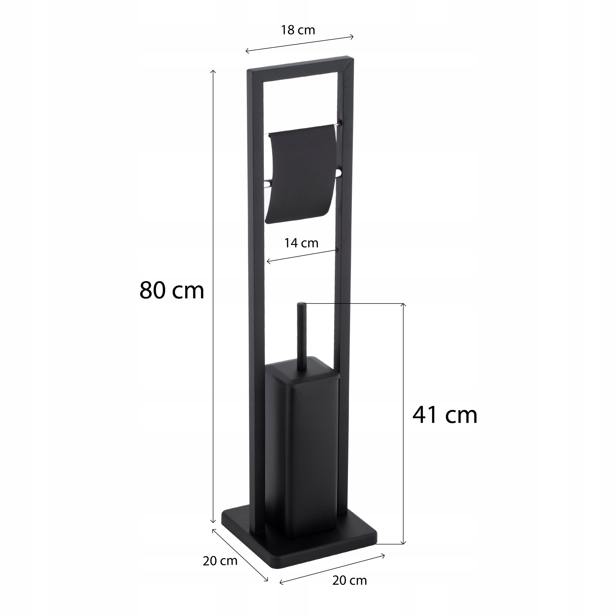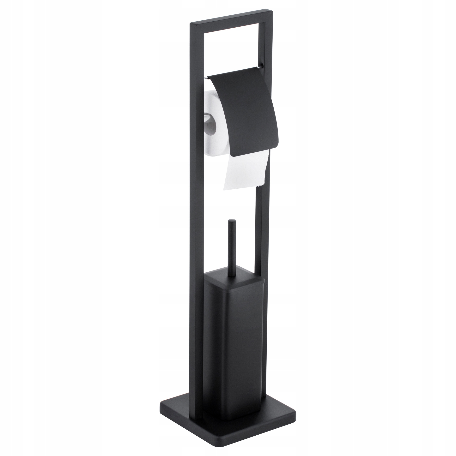 Тримач для туалетного паперу з туалетною щіткою та тримач для туалетного паперу з клапаном. Виготовлений із високоякісної сталі з порошковим покриттям чорного. Щітка для туалету має пластиковий контейнер, який захищає від іржі та полегшує очищення. Протиковзка основа забезпечує підставці чудову стійкість.