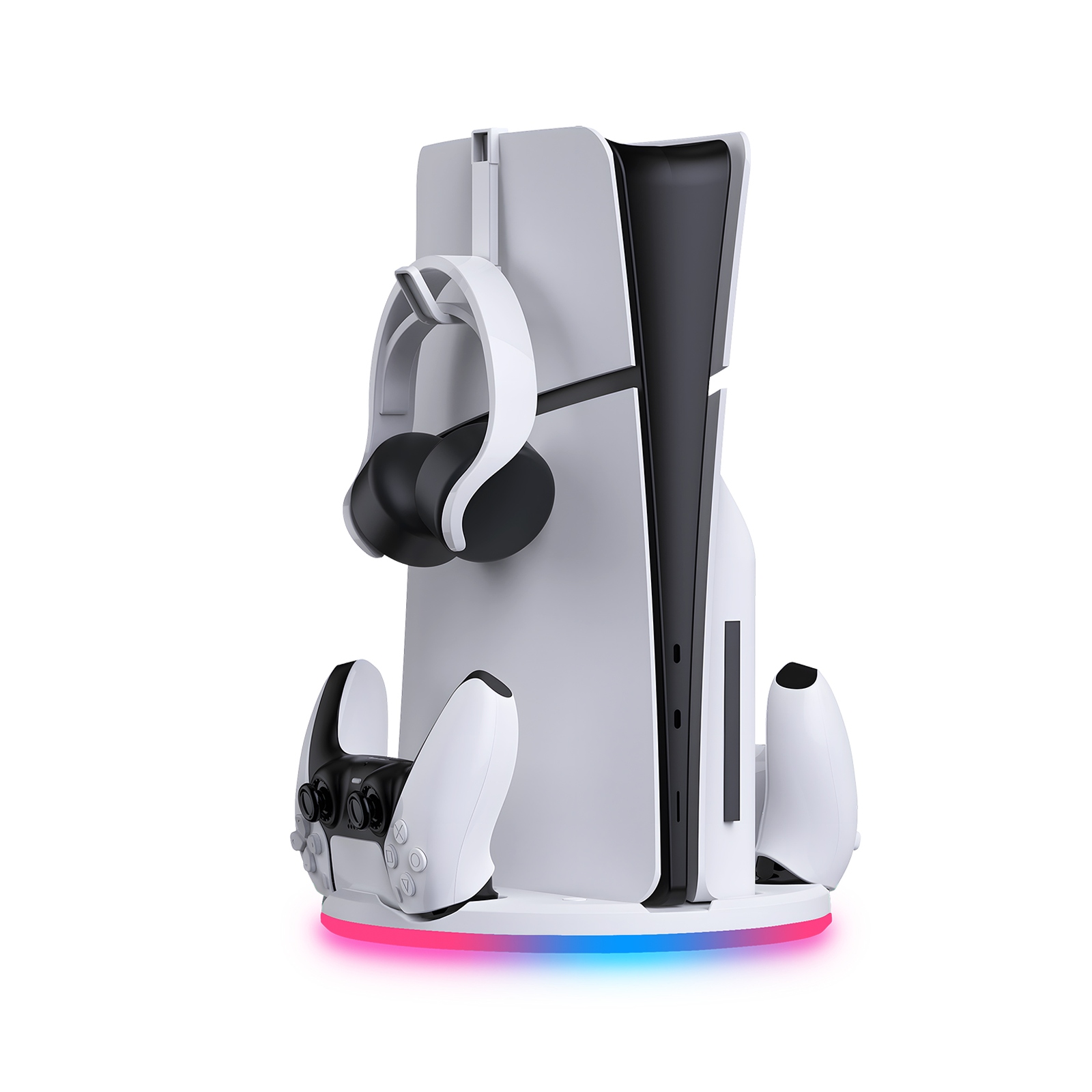 Вбудована функція підставки та станція для заряджання контролера дозволяють не тільки стабільно розташувати консоль PS5 Slim, але також дозволяють заряджати два контролери одночасно, що економить місце, є практичним і естетичним.