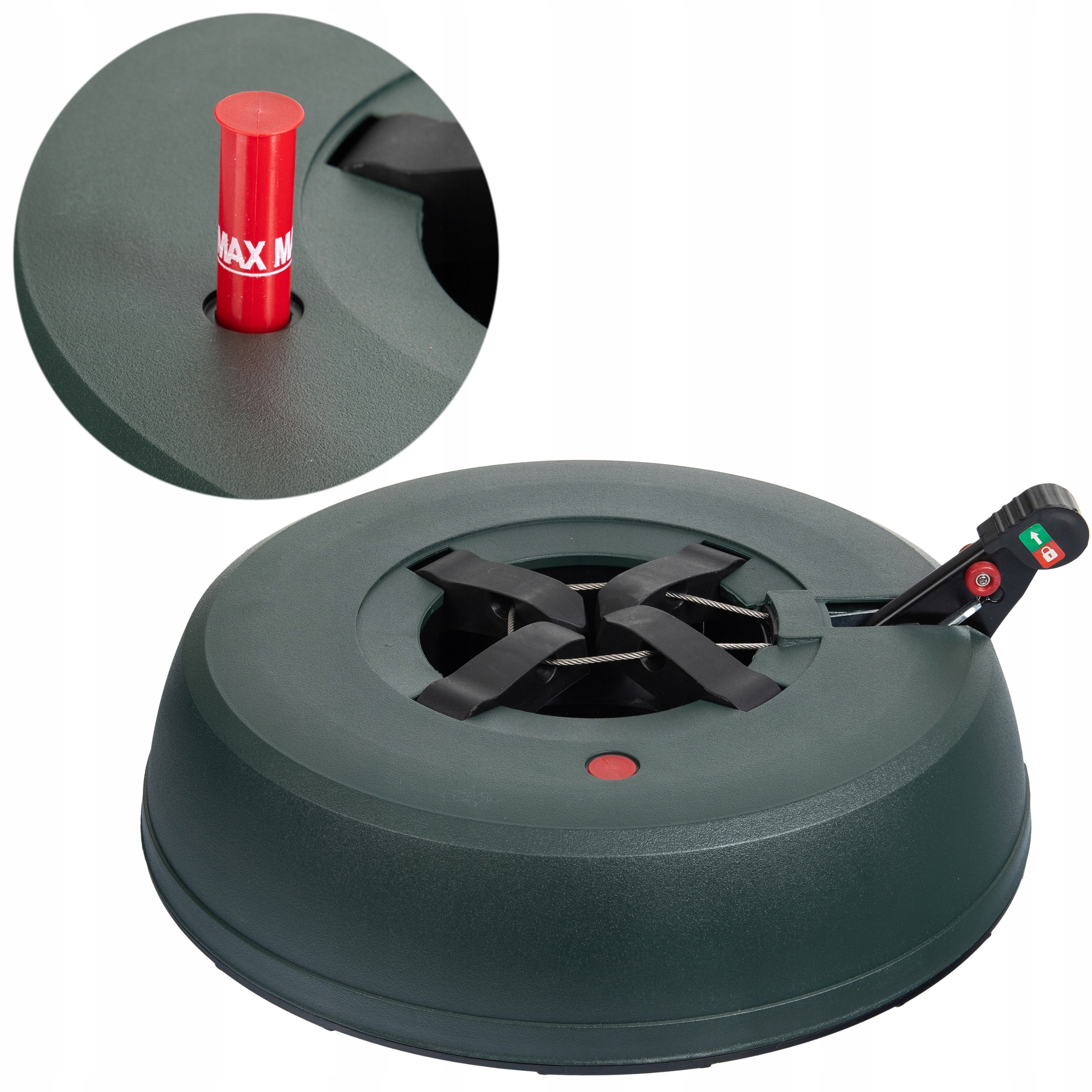 Підставка міцна під справжню ялинку, важка, з ємністю для води та водяним рівнем індикатор (індикатор не потребує роботи від батарейок), для ялинки максимальною висотою 2,3 м з механізмом автоматичного закриття підставки.