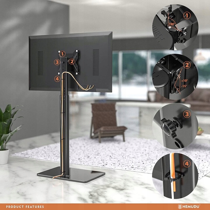 - Індивідуальний дизайн – ця розумна підлогова підставка для телевізора має цоколь із загартованого скла товщиною 10 мм, який з’єднаний із міцною сталевою колоною для забезпечення стабільного кріплення телевізора. Він може перевозити до 45 кг