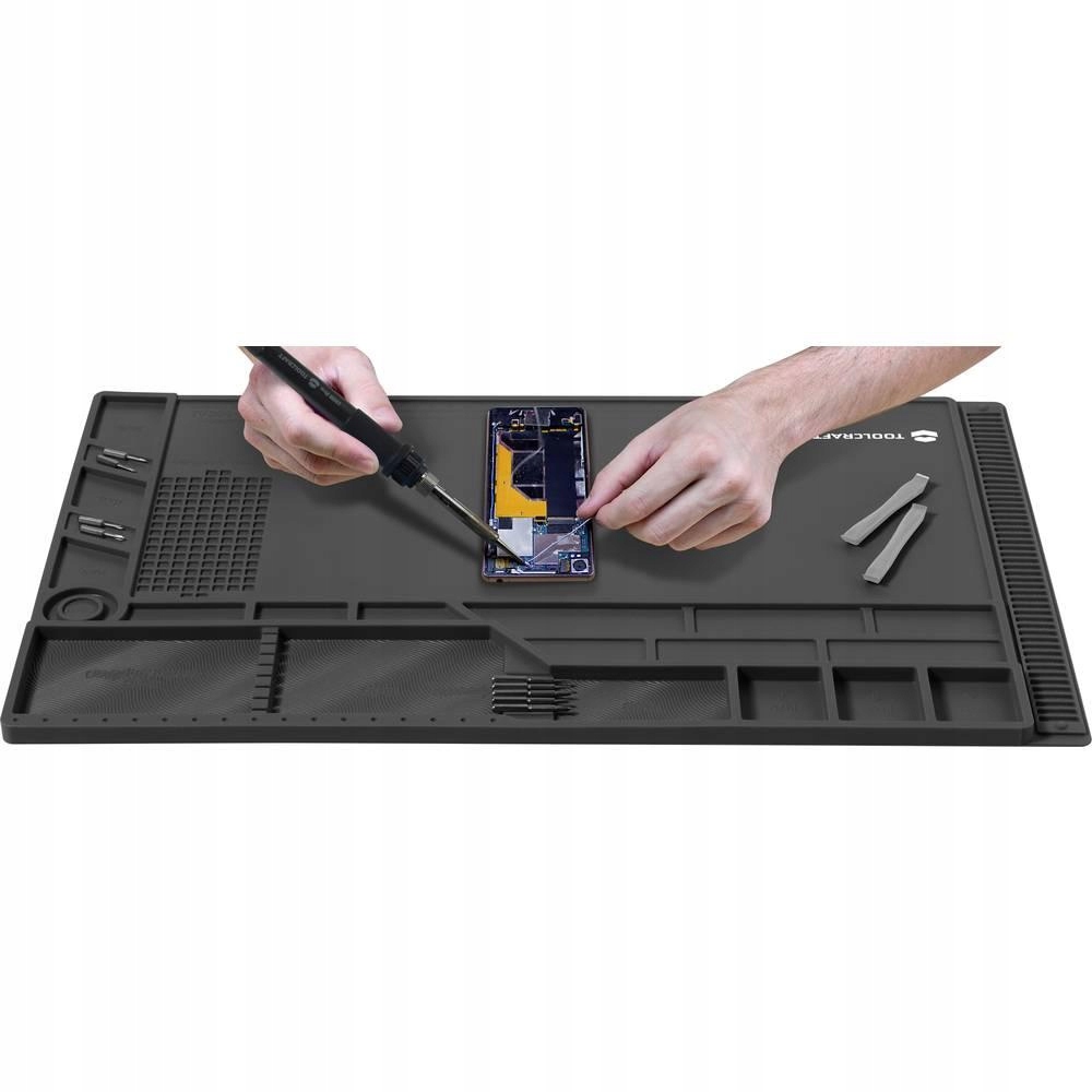 Цей універсальний килимок ідеально підходить для пайки та ремонту. Відмінні термічні властивості. Термостійкість до 500 °C. Паяльник можна класти прямо на поверхню. З магнітним накопичувачем для дрібних деталей