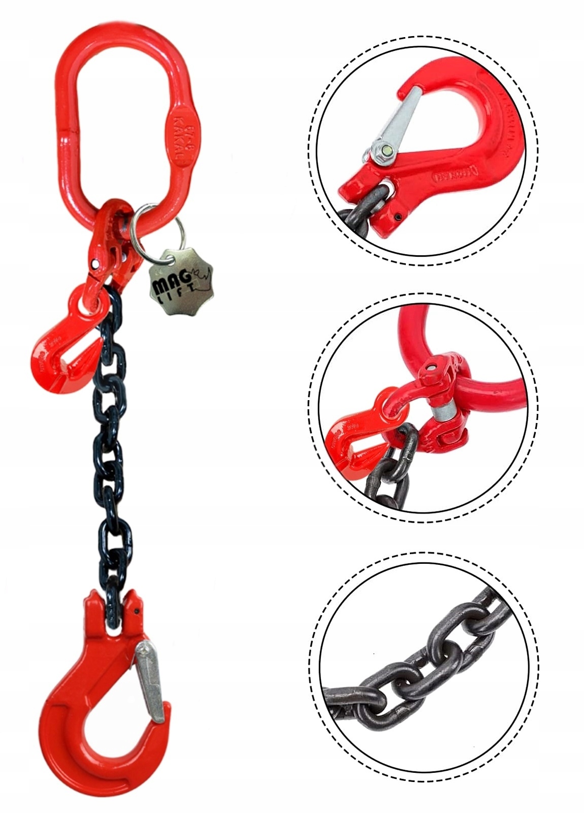 ВИКОНАННЯ: ланцюговий строп з 1 ланцюгом, виготовлений відповідно до PN-EN 818-4 із сертифікованих компонентів і ланцюга строп з міцністю на розрив 800 Н/мм2 / GR8 / і відповідає вимогам Директиви про машини 2006/42 /WE ред. Травень 2006.