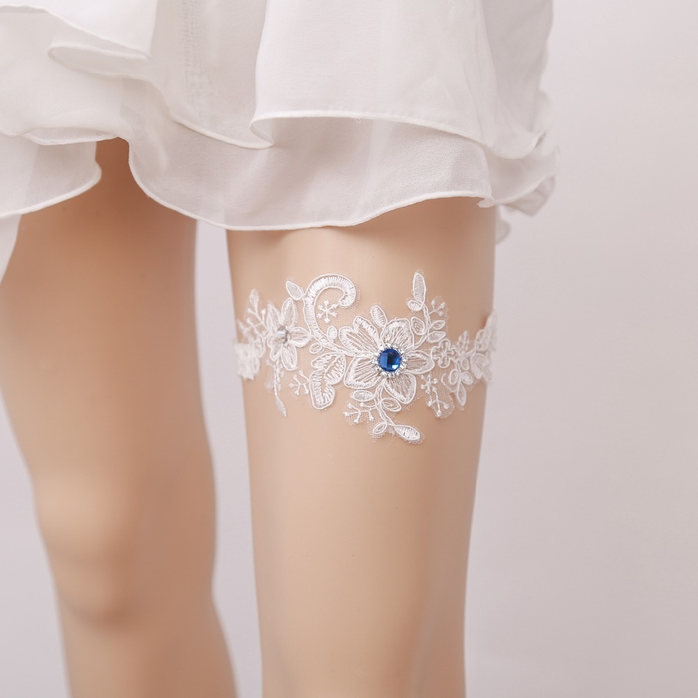 Фантастична біла весільна підв’язка з мережива, прикрашена великим блакитним цирконом.