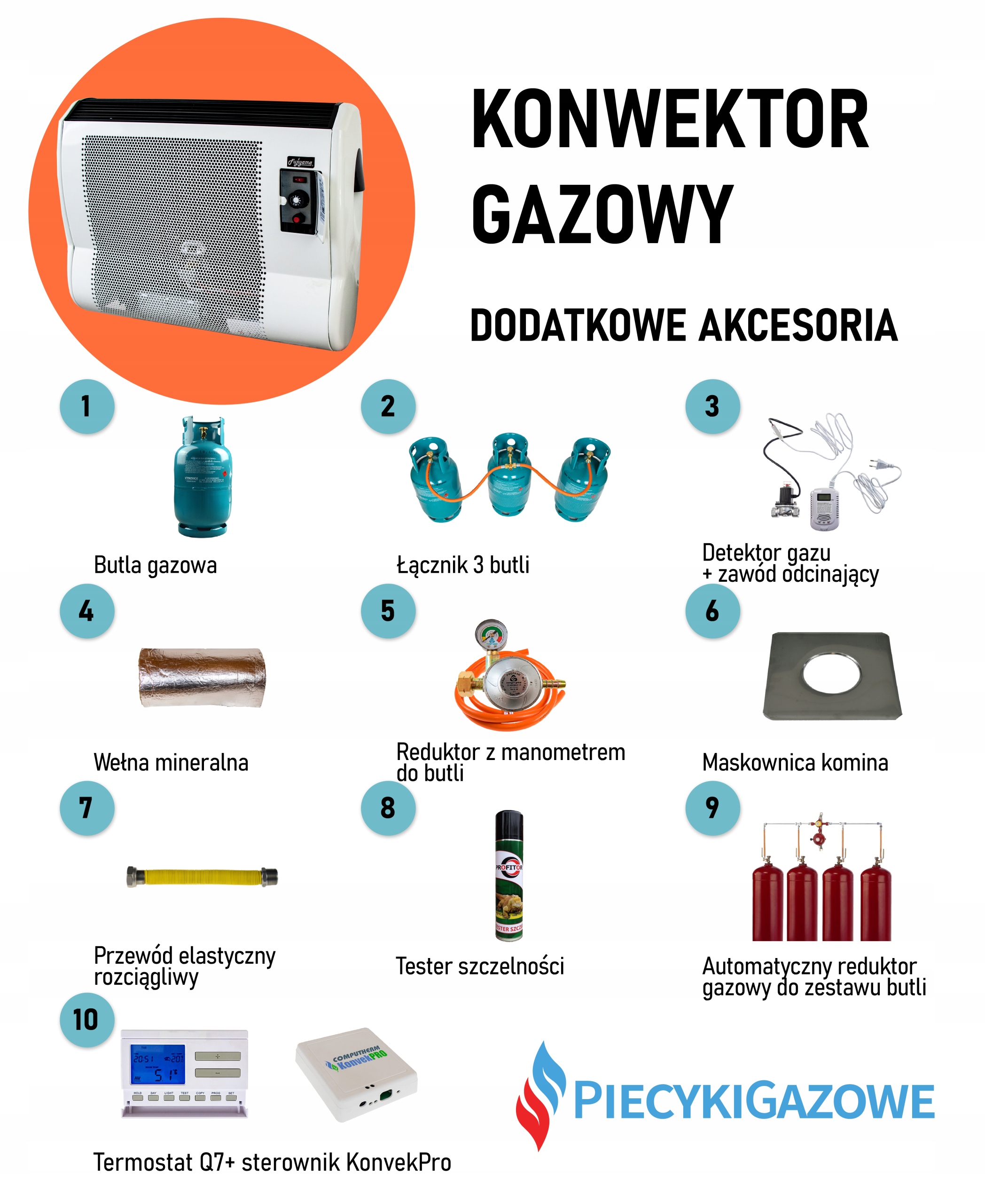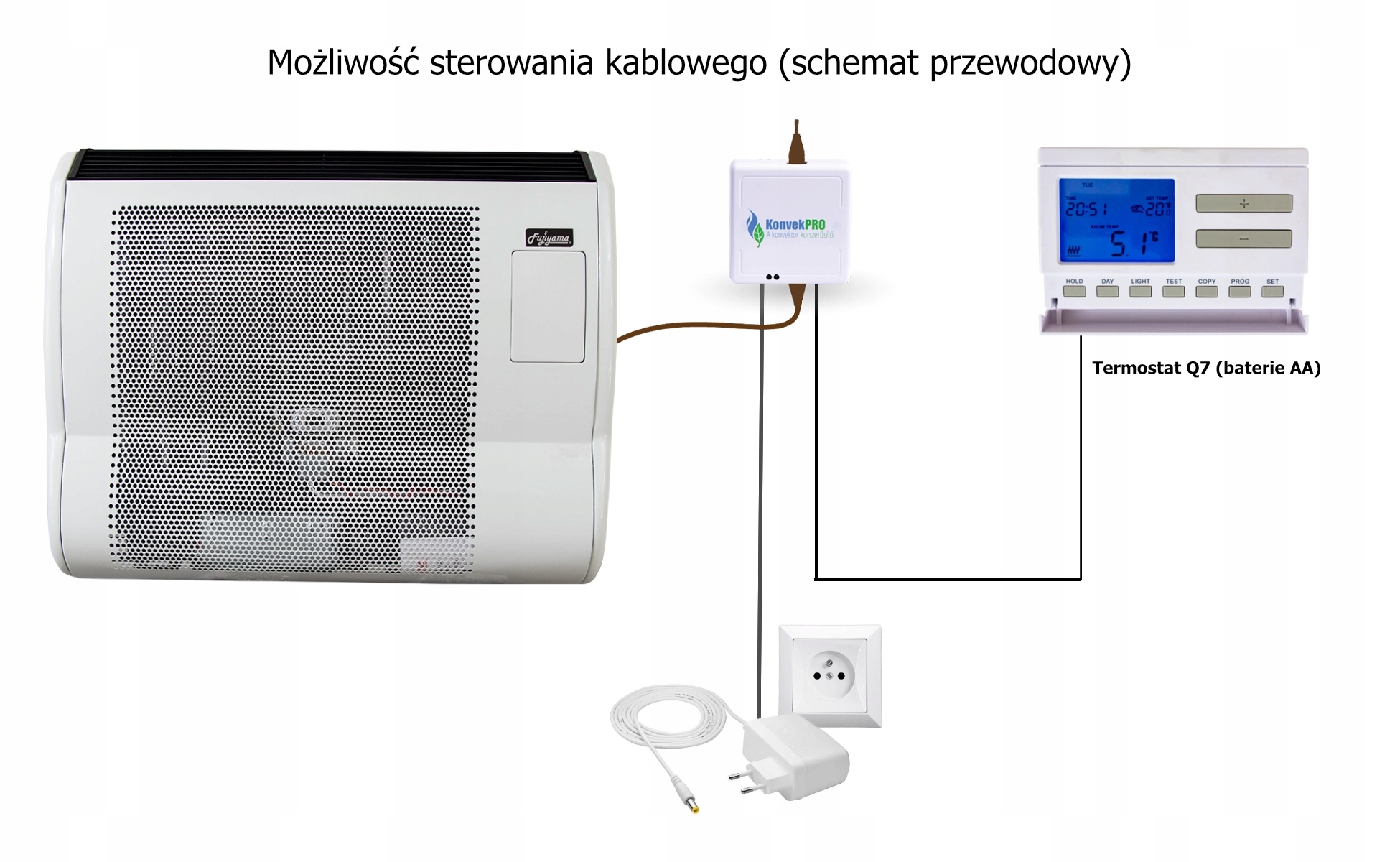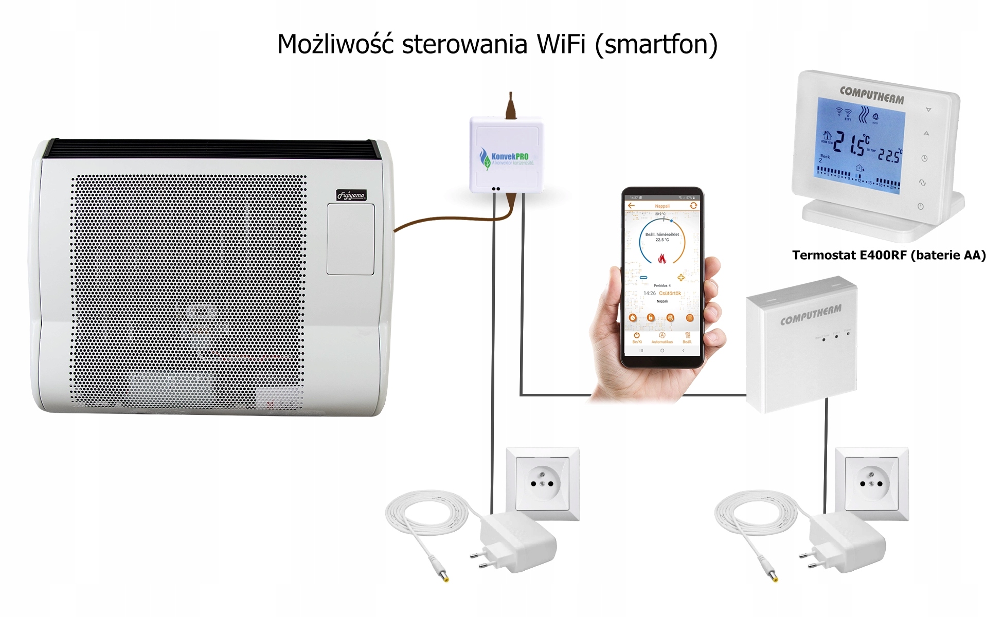 Механічний термостат - це найпростіший спосіб контролювати роботу газової печі. Контроль здійснюється через ручку з плавним 7-ступінчастим регулюванням в діапазоні 13 ° С-30 ° С. Термостат для печі встановлюється датчиком (мідна вставка, що містить розширювану рідину, підключену до термостата з капілярною) кімнатною температурою. Коли датчик виявляє, що кімнатна температура близька до того, що встановлений на термостаті, це зменшить потужність палички газу або вимкне його. з програмним термостатом - фактично контрольним газом. "Konvekpro" - це контролер, який безпосередньо контролює роботу газового нагрівача. Він отримує інформацію з програмованого термостата, при якому очікувана температура встановлюється 5 ° C-25 ° C та робочий час плиту. "Konvekpro", залежно від потреб, нагріває датчик механічного термостата в газовому конвекторі, який закриває або обмежує подачу газу на пальник. Це дозволяє нам заощадити газ, більш зручне використання печі. Весь набір "Konvekpro" та програмованого термостата простий у встановленні, ви можете зробити це самостійно. Він може бути модернізований новий газовий конвектор, придбаний у нашому магазині та вже належить газовій плиті. Піч через термостат Wi -Fi. "Konvekpro" - це контролер, який безпосередньо контролює роботу газового нагрівача. Він отримує інформацію з програмованого термостата, при якому очікувана температура встановлюється 5 ° C-25 ° C та робочий час плиту. Графік роботи газова конвектора встановлюється щодня та/або щотижня. У цьому випадку ми можемо вибрати, щоб встановити графік через додаток для телефону та через панель управління термостатом. Він призначений для модернізації нових газових конвекторів, придбаних у нашому магазині, а також для вже власних обігрівачів.