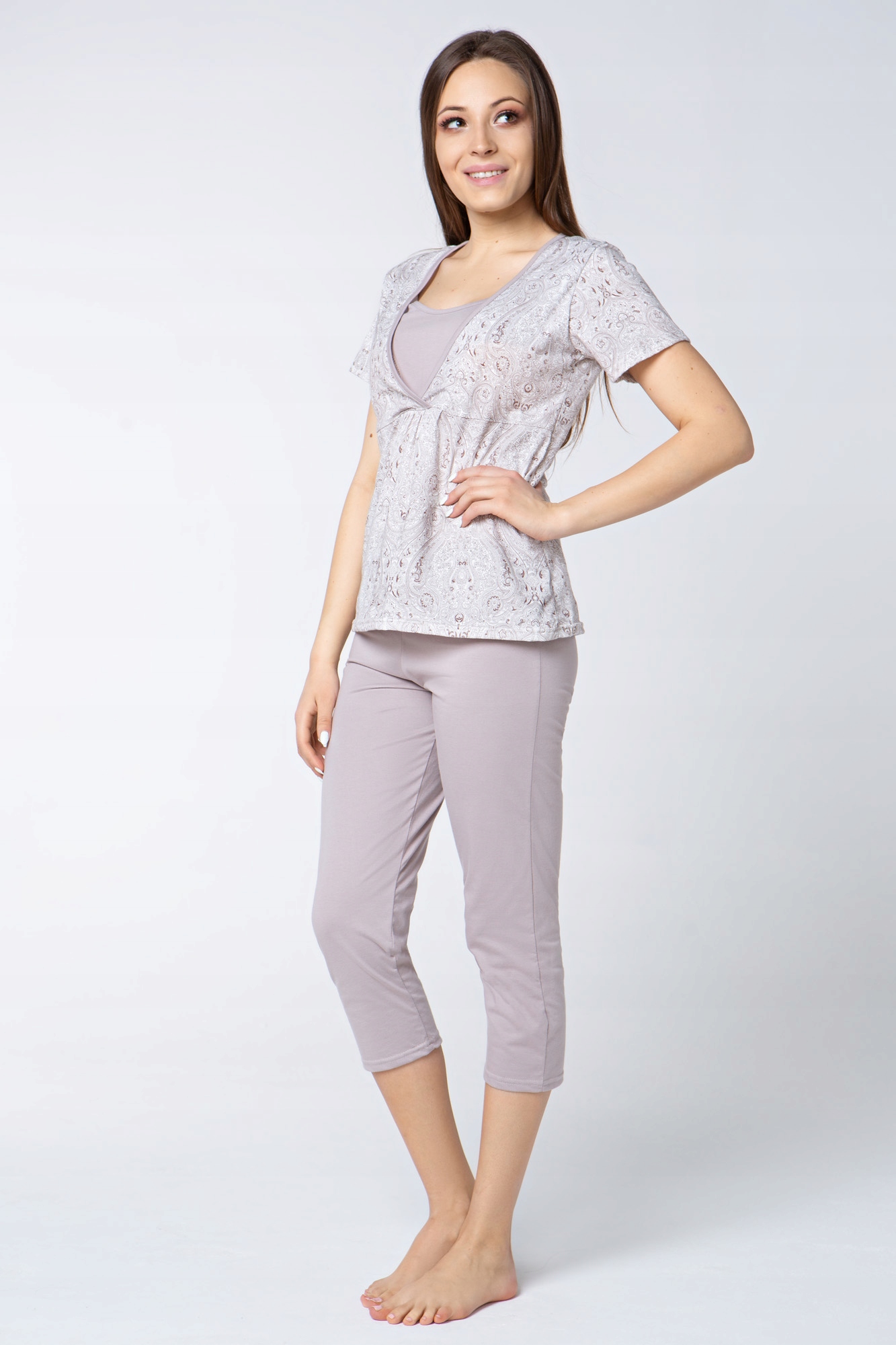 Жіноча піжама, яка була створена для вагітних жінок та годуючих матерів. Він був виготовлений з бавовни і має два стриманих кишень, які забезпечують комфорт під час годування. У блузці є короткий рукав і чарівний принт із зірками, а також ніжні, гладкі штани. Набір з найвищої якості матеріалів.