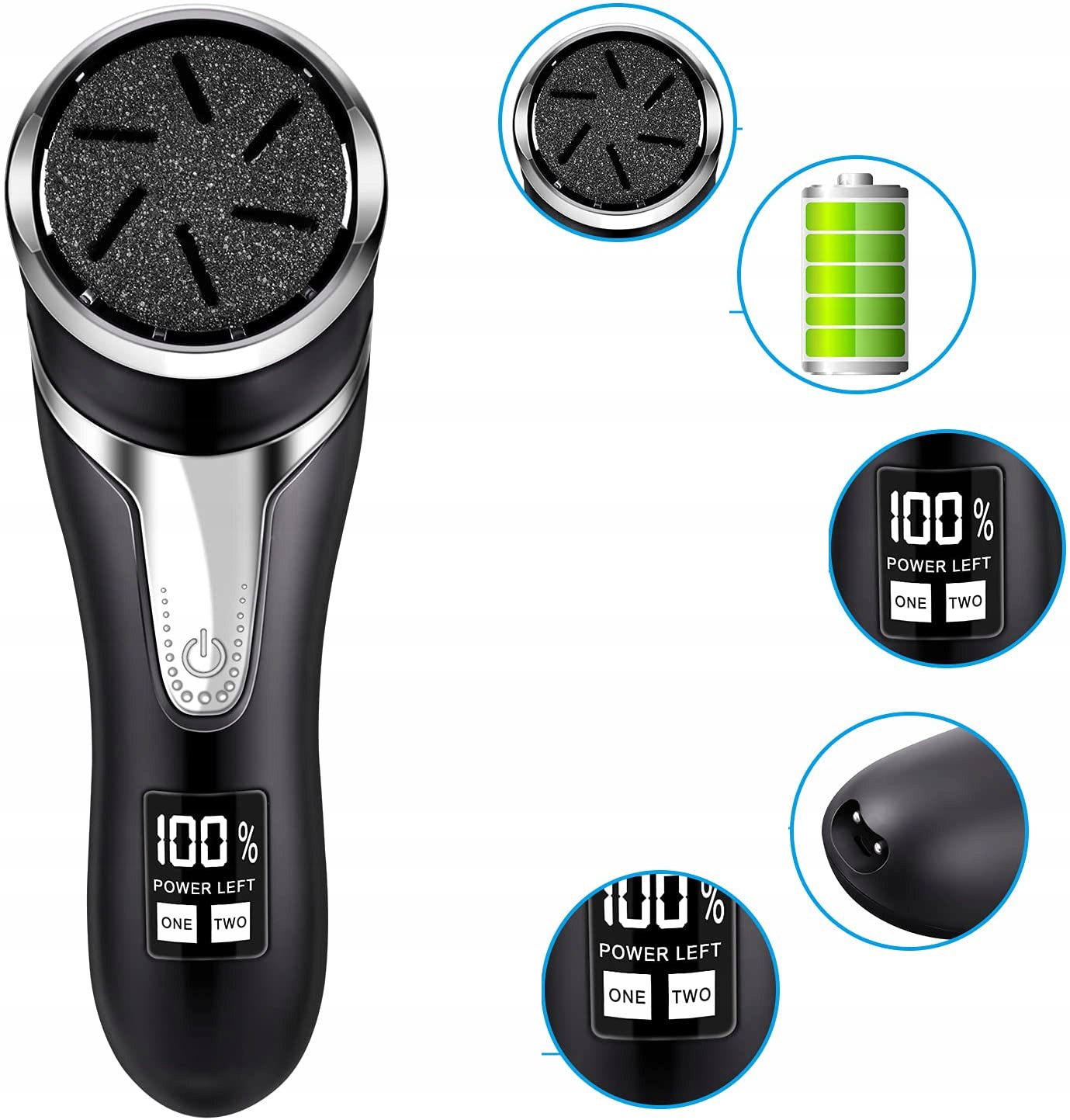 - Є 3 змінні шліфувальні шліфувальні машини на вибір, груба шліфувальна машина для впертих мозолів, середній подрібнювач для грубої, мертвої шкіри та тонкий подрібнювач для щоденного догляду за шкірою.
