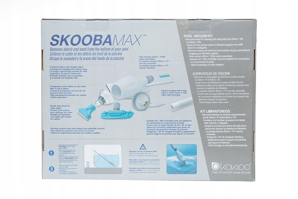 Швидка та проста установка пилососа без використання інструментів. Вбудований мішок Фільтрування фіксує більші домішки та запобігає засміченню фільтр. Рекомендується спеціально для наземних басейнів від 2,4 м до приблизно. 5,5 м. Мінімально необхідна продуктивність насоса фільтрів становить 2 м3/годину і 45 Вт. підходить для фільтрації Cartouche та піску. Містить Гнучкий шланг завдовжки 6 м та 3 адаптери для підключення до Більшість брендів наземних басейнів. Поставляється зі світлим складанням Алюмінієва ручка з діапазоном 2,2 см. Дві замінні форсунки включені. Один Поворотна насадка з пензлями, друга постійна насадка.