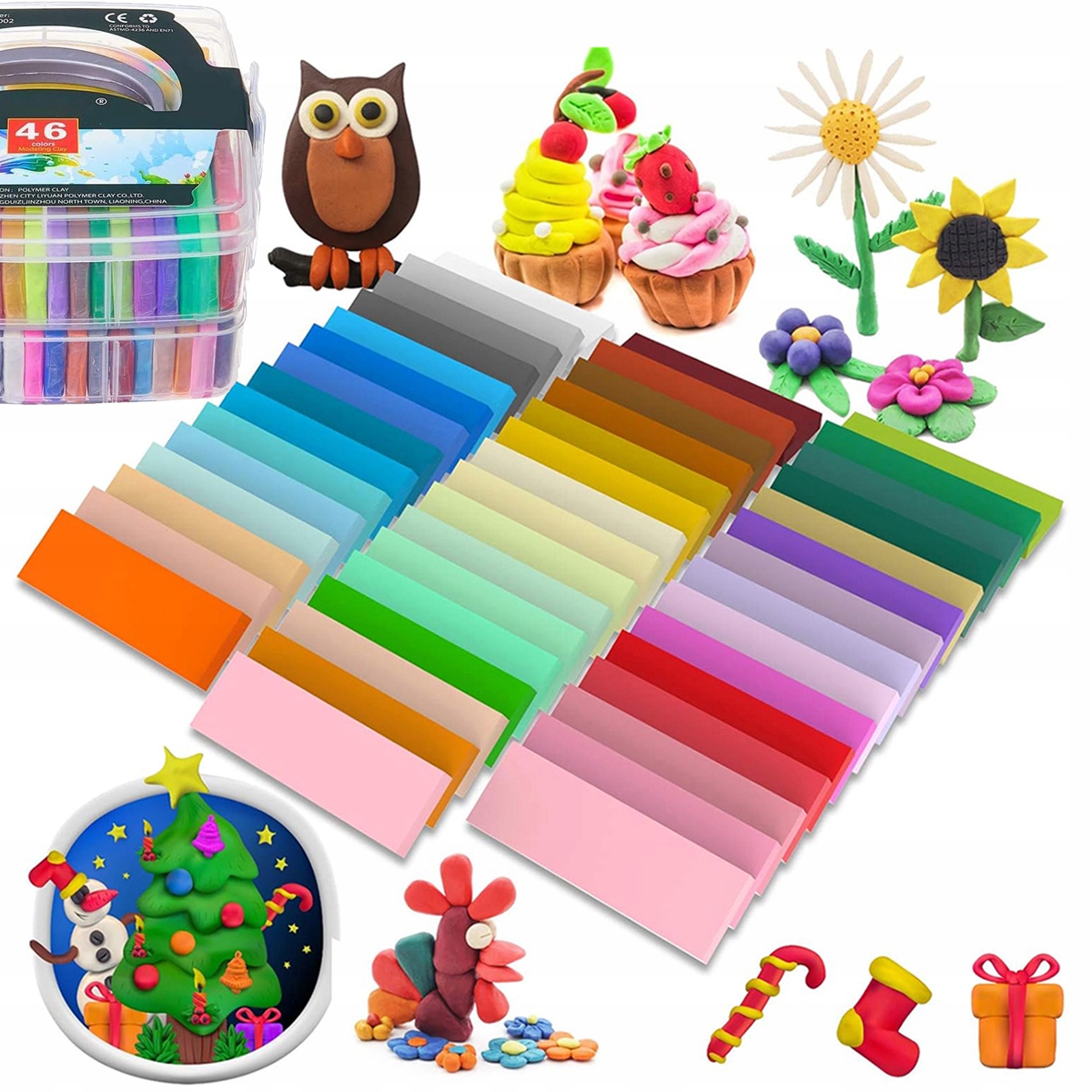 46 кольорових штук обпалена в печі глина (28 г/штука), 1 двошарова коробка для зберігання, 5 інструментів для укладання та 40 ювелірних аксесуарів, зручно зберігаються в милому прозорому пластиковому контейнері в коробці. Легко створюйте сережки, брелоки, заколки для волосся та кільця. Найкращі подарунки ручної роботи.