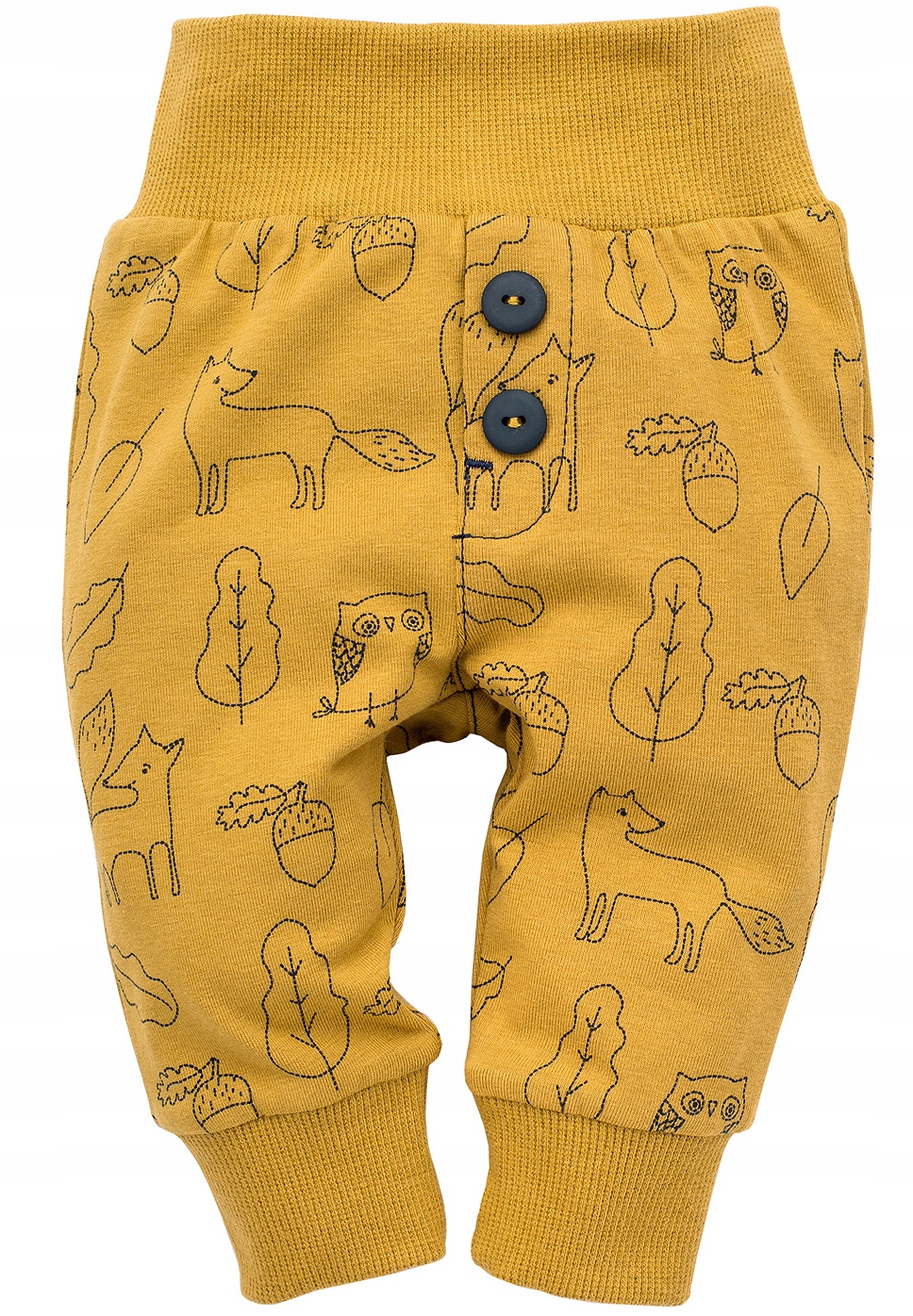 Комфортні дитячі легінси модного кольору каррі, з контрастною строчкою. На талії є широкий, не стягуючий шнурок, який утримує одяг на місці. Легінси мають чарівні принти лісових тварин і листя, виготовлені за допомогою стійкого та безпечного методу фарби на водній основі. Спереду легінсів ми розмістили два гудзики, які імітують застібку. Відповідний крій забезпечує комфорт дитині та не сковує рухів під час гри.