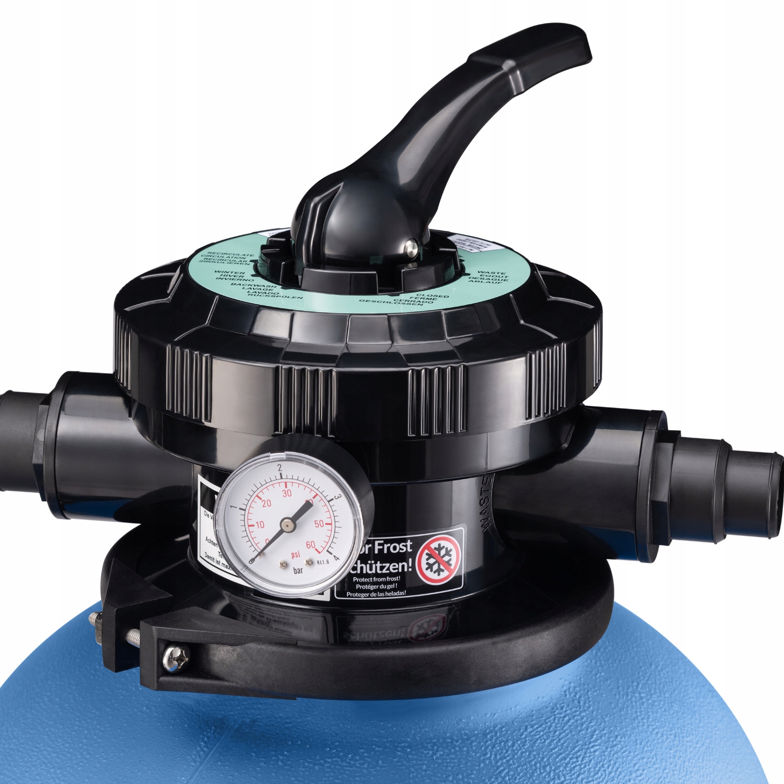 Набір для фільтрації води для басейну складається з насоса для басейну та піщаного фільтра з 7-ходовим клапаном, встановленим у верхній частині, і насосом із крильчаткою. Включає чіткий манометр.