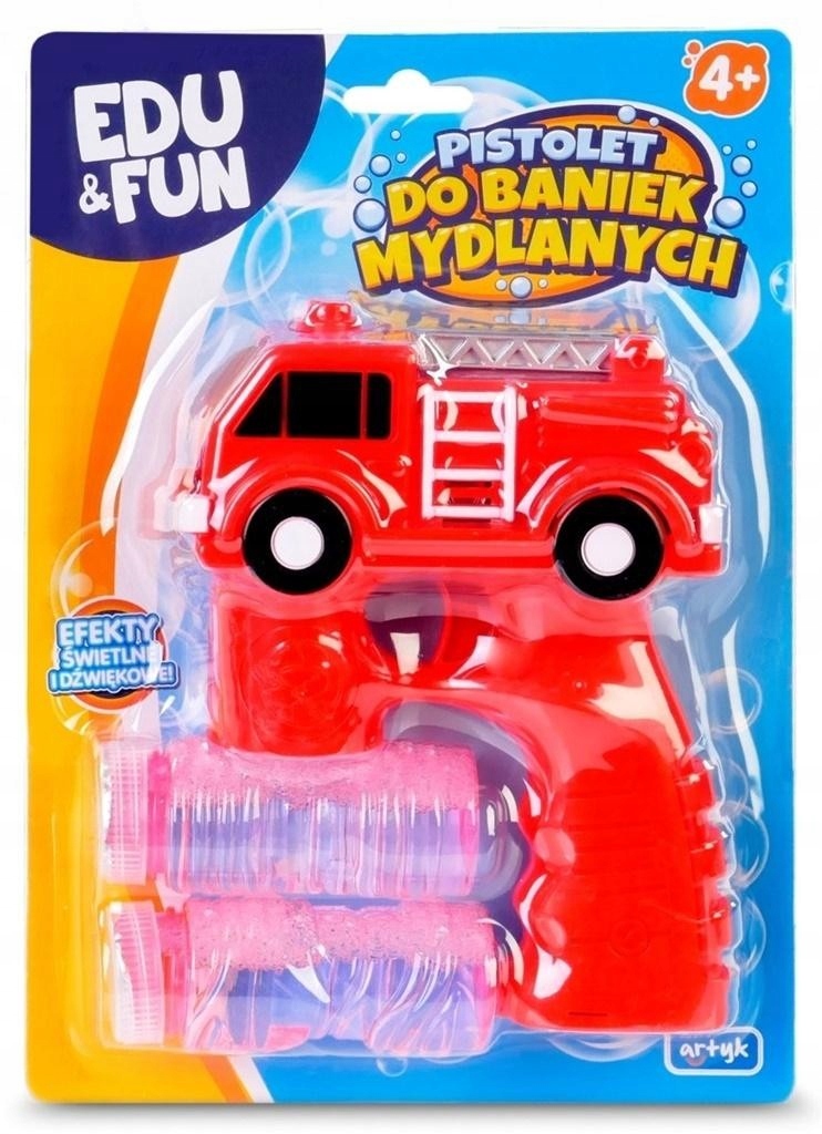 Банковий пістолет у формі пожежної машини, дві ємності з рідиною. Пістолет зі світловими ефектами, веселими мелодіями і звуками сирени. Світло підкреслює бульбашки. Батарейки: 3 x AA/LR6, 1,5 В - в комплект не входять. Дуже весело.