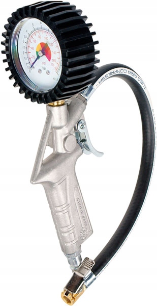 Пістолет для накачування шин FG завдяки манометру дозволяє контролювати тиск і поповнювати повітря в шинах. Корпус виготовлений з надлегкого алюмінію і стійкий до пошкоджень. Максимальний робочий тиск 10 бар. Має практичний гачок для підвішування. Пістолет простий у використанні та має профільовану рукоять, тому ним зручно керувати. манометр дозволяє легко зчитувати поточне вимірювання. Він захищений гумовою кришкою, що знижує ризик пошкодження манометра. Оснащений штекером D-типу для підключення швидкого роз'єму. Продукт є ідеальним рішенням для будь-якої майстерні.