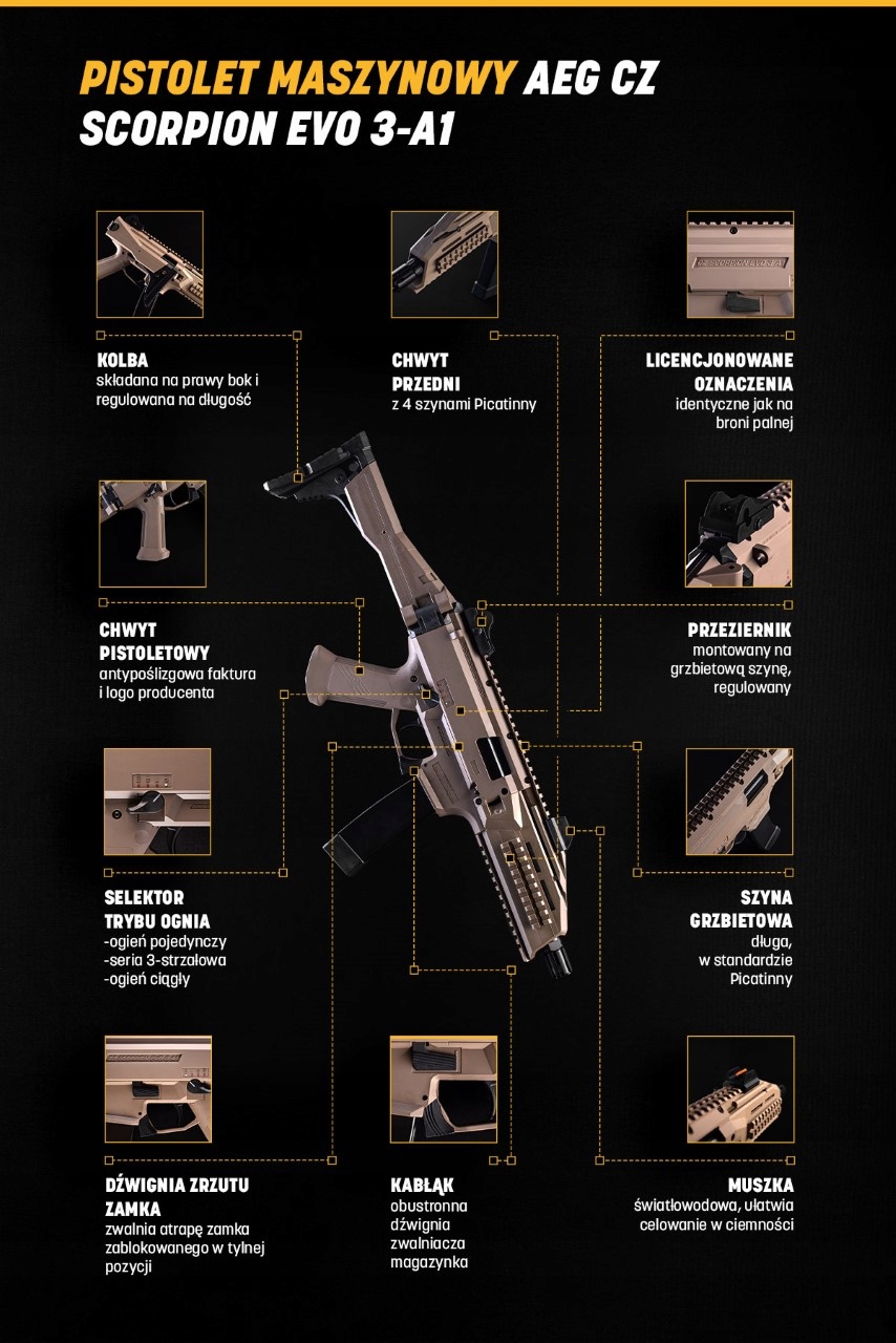 , що виробляється в Європі реплікою Action Sport Games REPLICA CZ SCORPION EVO 3 A1, заснований на ліцензії Чески Збройовка, творців оригіналу. Він складається з полімеру та металу, затриманого склом, тиск розміщується на міцності. Основна конструкція, передня ручка, рейки RIS, складка колби, зчеплення для зберігання та журнал виготовлені з полімеру. Метал-зовнішня бочка, шпильки та гвинти, перезавантаження важеля та болт-ковпак.