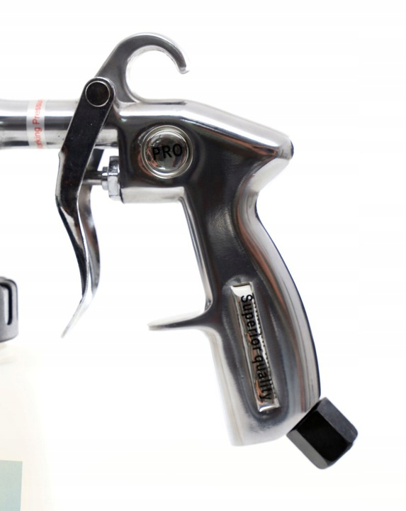 Якісний пістолет для вологого очищення кузова та салону автомобіля від бруду, призначений як для любителів, так і для професіоналів, в тому числі: вентиляційні отвори, кондиціонер, дзеркальні та пластикові елементи, сидіння, оббивка, килими, бруд та забруднення, які важко видалити. Завдяки насадці спеціальної форми з обертовим сердечником, пістолет виробляє під впливом стисненого повітря пінний миючий розчин, який очищає всі елементи, лише злегка змочуючи їх! Це дуже ефективний пристрій, він використовує мінімальну кількість води та миючих засобів. Досягає всіх важкодоступних місць, щілин, куди не дотягнеться звичайна губка, ганчірка, щітка чи щітка!!! Ідеально підходить для комерційного чищення різних типів поверхонь, таких як оббивка, меблі, диски, повітрозабірники тощо. Для роботи не потрібні великі компресори, достатньо тиску 5 бар. Пістолет має регулювання дозування хімікату, що дозволяє адаптувати розчин до поверхні, що очищається.
