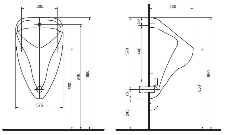 Пісуар укомплектований, готовий до підвішування та підключення.