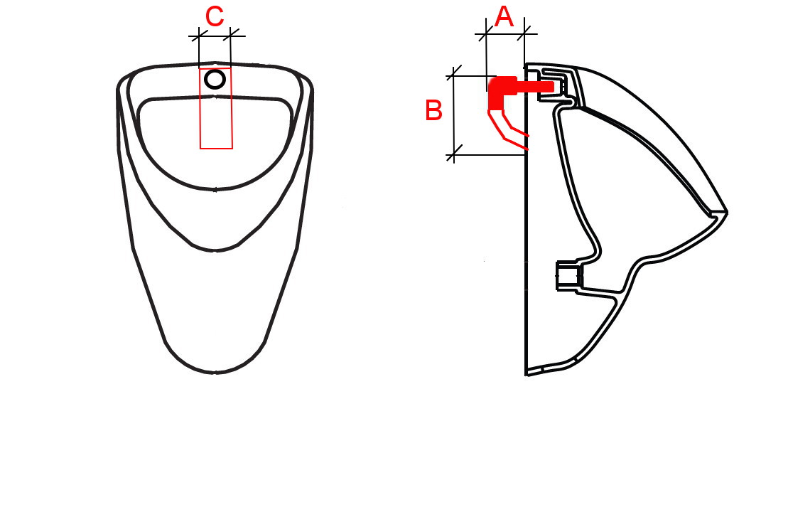 Ця модель пісуара потребує виїмки з максимальною глибиною 50 мм на вході води в пісуар, як показано на ескізах вище.