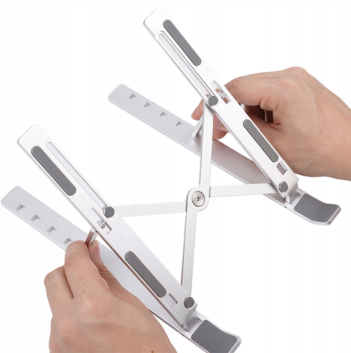 Алюмінієвий складаний столик для ноутбука. Характеризується легкою і міцною конструкцією. Це дозволяє комфортно користуватися ноутбуком навіть у положенні лежачи. Багатоступеневе (6) регулювання нахилу стільниці дозволяє підлаштувати стіл під потреби користувача. Це надзвичайно ергономічне рішення, яке підвищує комфорт використання ноутбука. Регульовані кронштейни дозволяють розмістити на підставці невеликі пристрої, такі як планшети та смартфони. Силіконові накладки на дні запобігають ковзанню підставки та можливим подряпинам.
