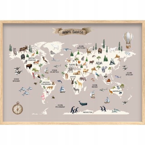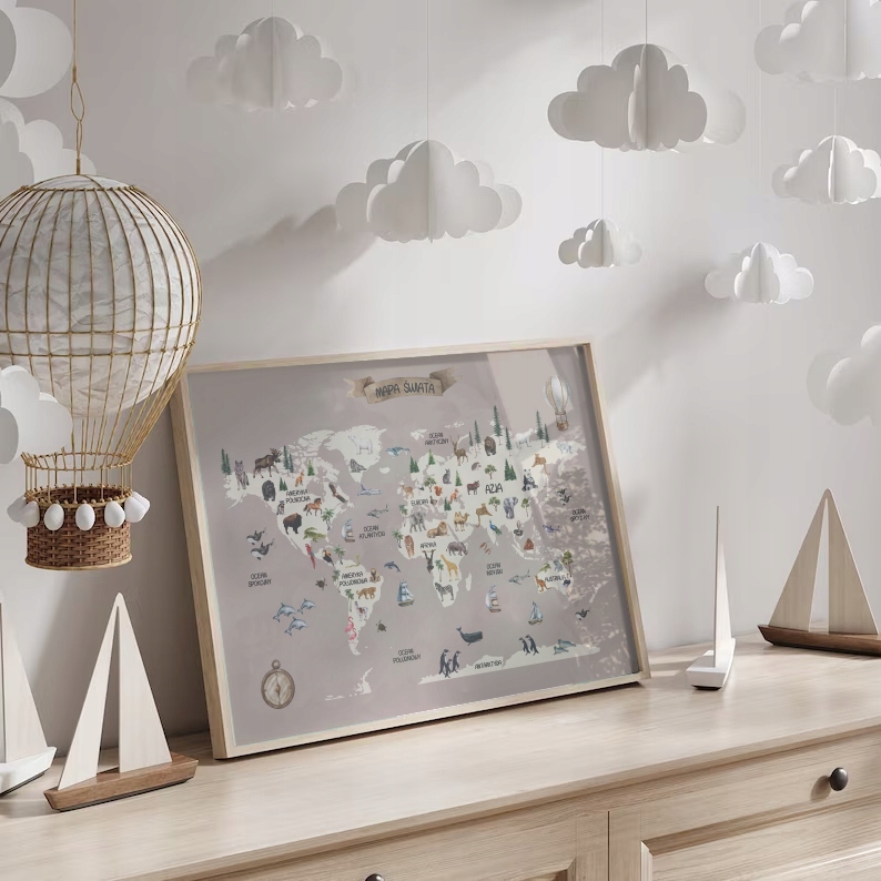 Відкрийте для себе захоплюючий світ природи з нашим незвичайним дитячим плакатом. Наша карта світу чудово проілюстрована, на ній представлено континенти й океани м’якими приглушеними кольорами. Кожен континент проілюстрований унікальними тваринами, які там зустрічаються. Це не лише гарний декор, але й чудовий спосіб приємно та цікаво вивчати географію та біологію.