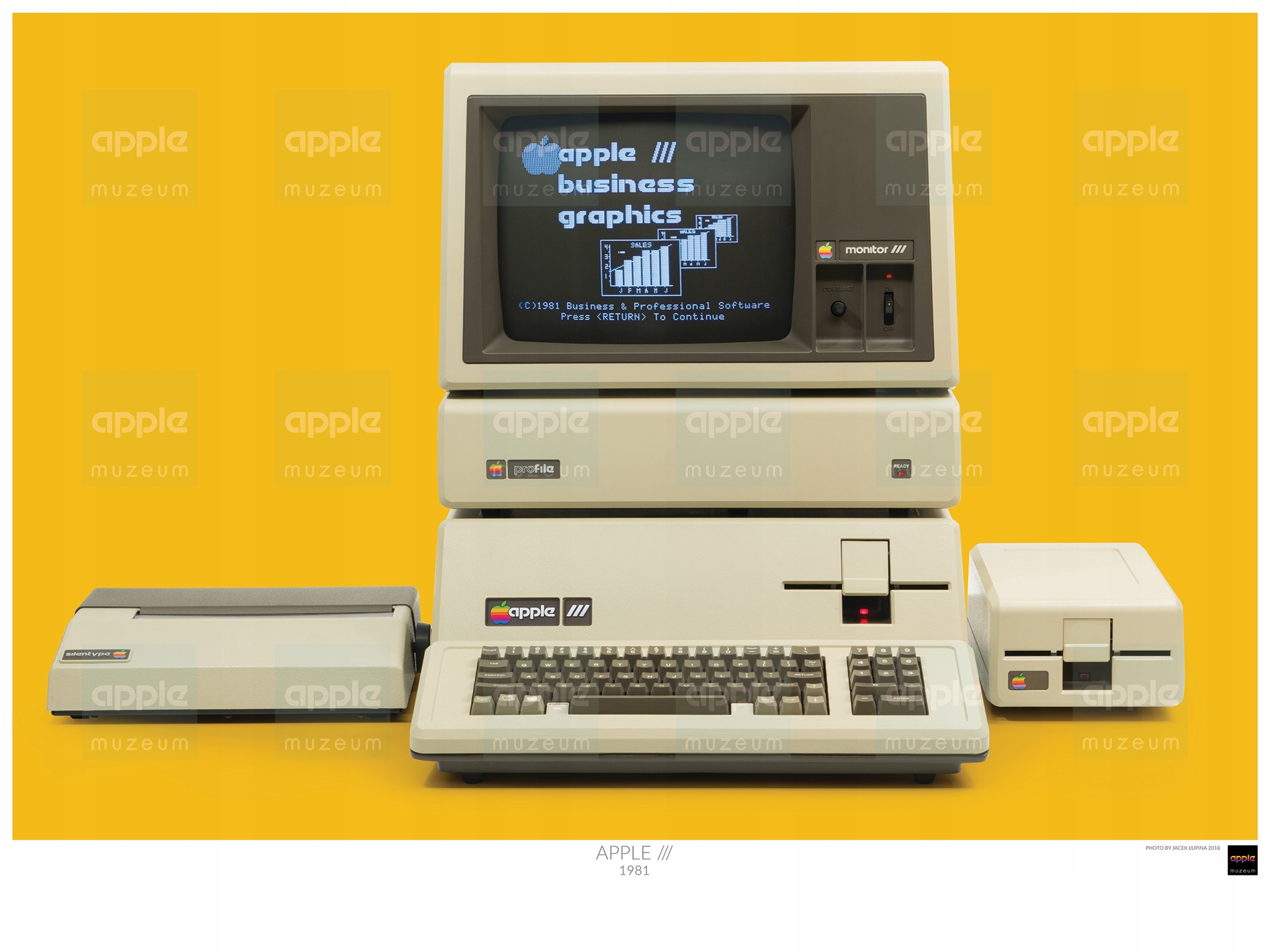На плакаті в альбомному форматі показано фото комп'ютера Apple III 1981 року.