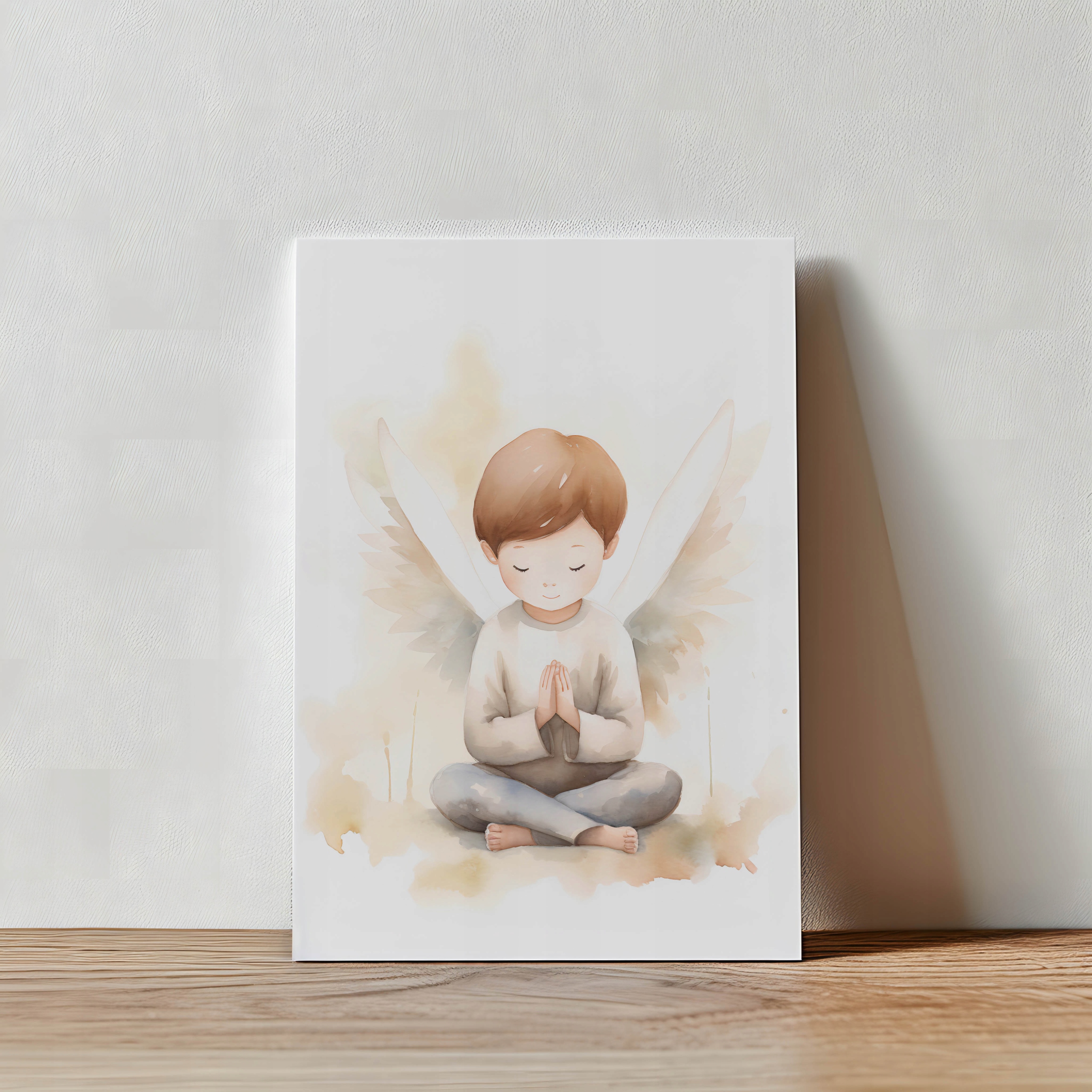 «Благочестиве споглядання» — плакат із зображенням ангела, що молиться у вигляді хлопчика, створений у тонкій акварельній манері. Картину вирізняють тонкі пастельні кольори, які створюють атмосферу спокою та духовної глибини. Хлопчик у молитві оточений м'якими відтінками, що підкреслює настрій роздумів і благочестя. Техніка акварелі додає роботі легкість і елегантність, а все це випромінює тепло і внутрішній спокій, сприяючи моментам роздумів і споглядання. Цей витвір мистецтва чудово впишеться в приміщення, призначені для тиші та глибоких роздумів.