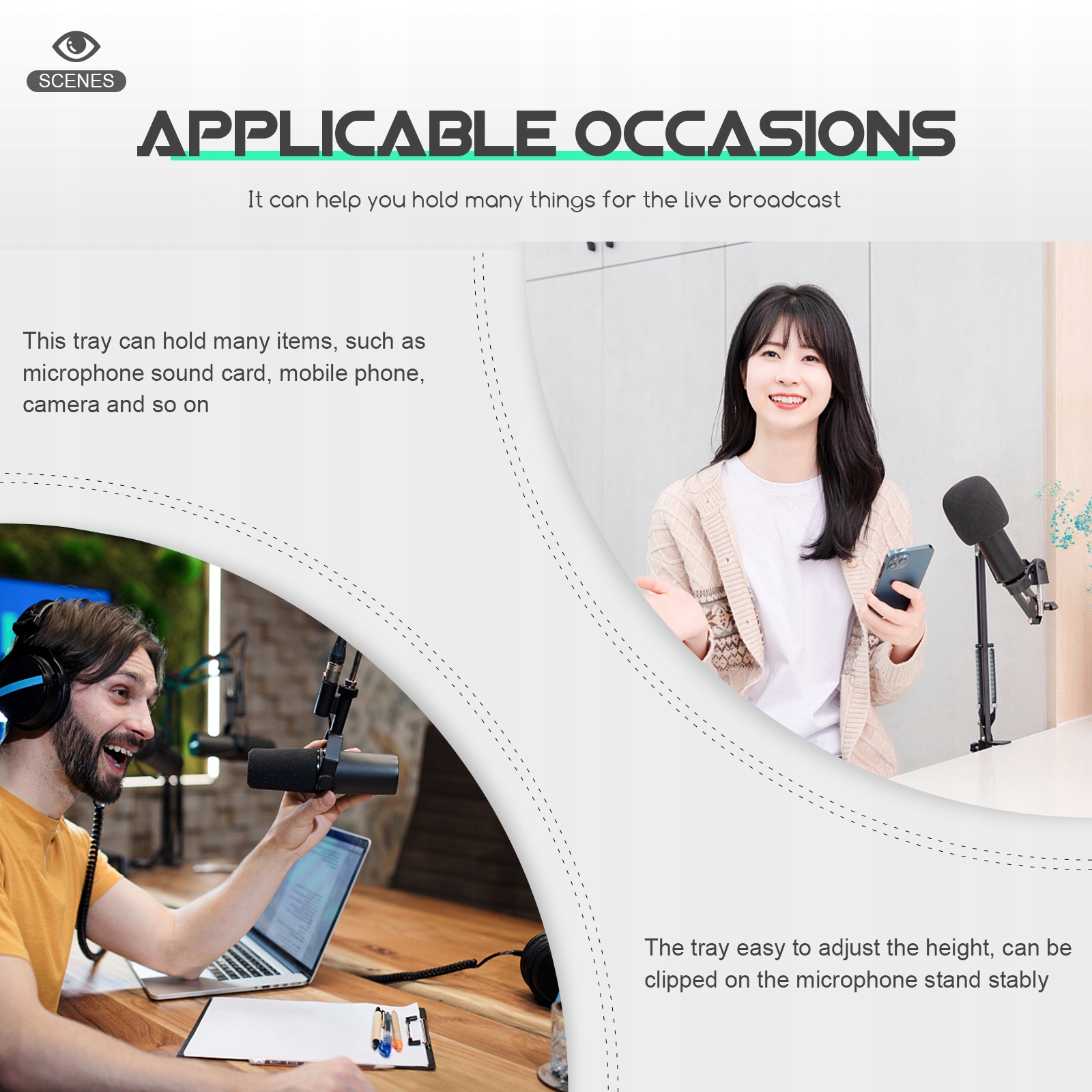 ✅Це підставка для мікрофонної стійки. Він виготовлений із пластику, міцний і довговічний у використанні. Регульована конструкція дозволяє встановлювати на мікрофонну стійку різних розмірів і вільно регулювати відповідну висоту. Це може допомогти вам зберігати багато речей для прямих трансляцій.