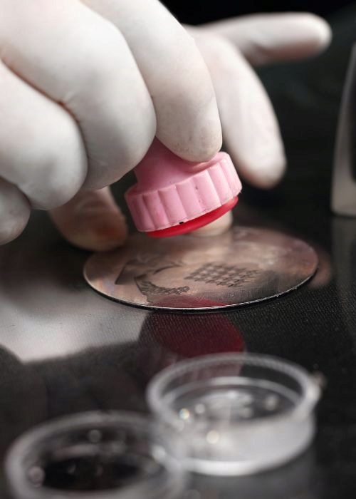 ❤ Передача шаблону на штамп: покладіть штамп у візерунок на лоток для випічки, обережно натискаючи. Шаблон буде перенесений на гнучку головку штампу.