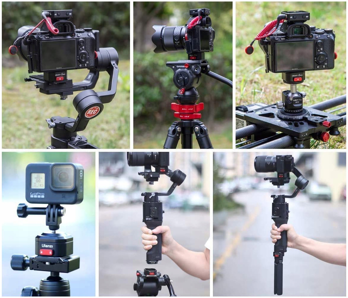 Монтажна пластина сумісна з усіма фотоапаратами, відеокамерами, лампами, мікрофонами, кріпленнями тощо – є лише одна умова: вони повинні мають стандартне гніздо для різьби 1/4 дюйма.