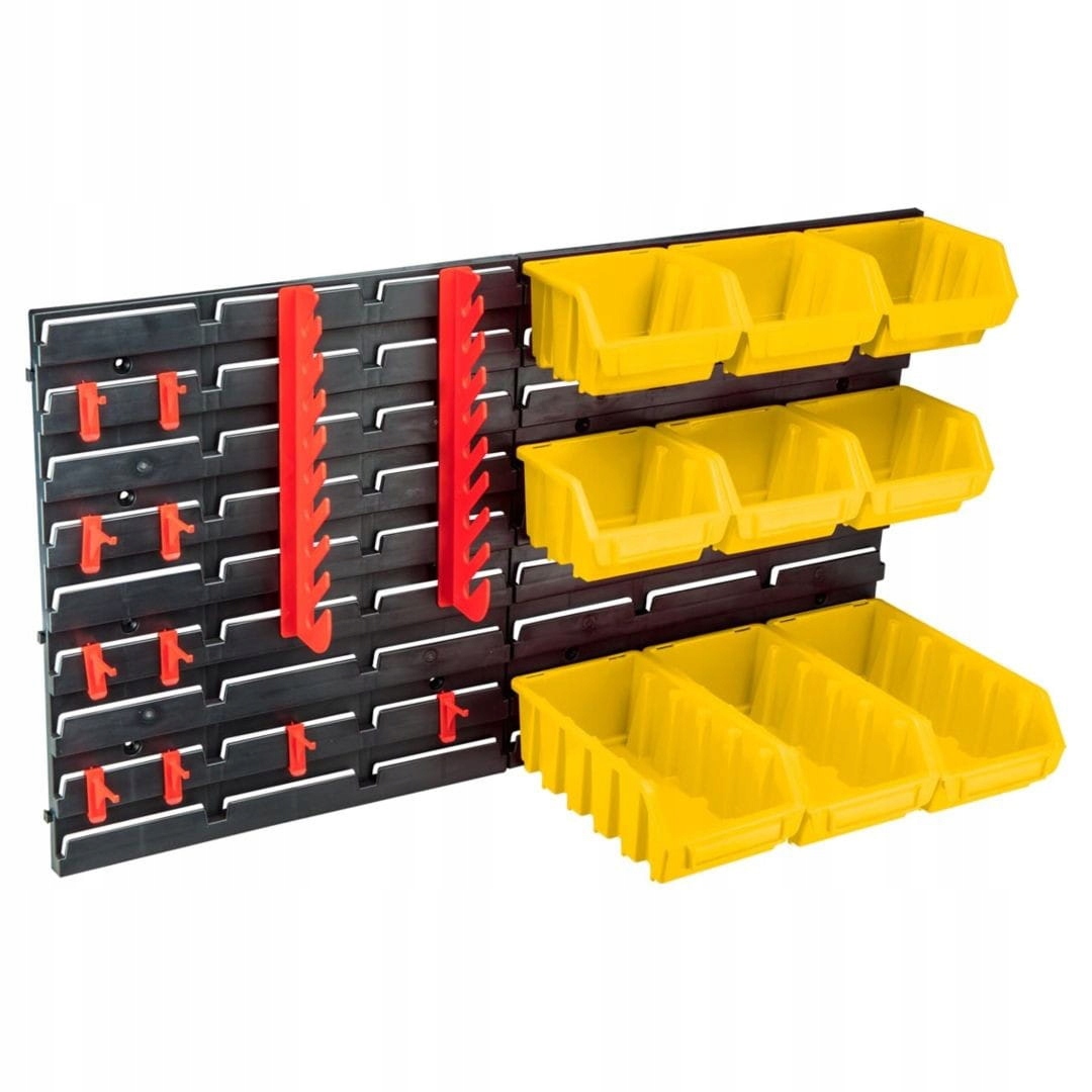 Дошка майстерні з контейнерами та аксесуарами Topex (посилання 79R171), розміри 69 x 38,5 x 22,5 см. Ця сучасна система дозволяє створити професійну майстерню навіть у невеликих приміщеннях. Завдяки контейнерам різних розмірів і набору спеціальних ручок можна зберігати різні інструменти. У набір входять 2 дошки для інструментів (35 х 38,5 х 2 см), контейнери для зберігання: 6 х (11,6 х 11,2 х 7,5 см), 3 х (11,6 х 21,2 х 7,5 см) і додатковий набір аксесуарів. Бренд TOPEX орієнтований на любителів DIY.